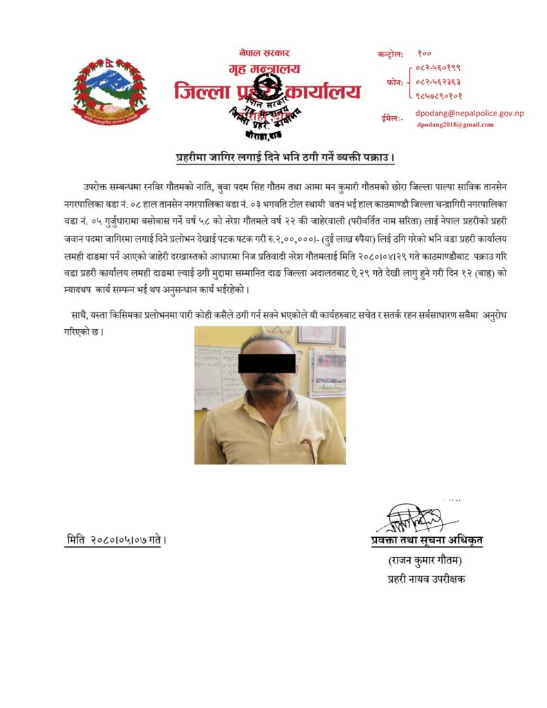 प्रहरी बनाइदिन्छु भन्दै एक युवतीबाट दुई लाख रुपियाँ ठगी गरेको आरोपमा गौतमलाई पक्राउ गरेको विज्ञप्तिमा उल्लेख छ ।
