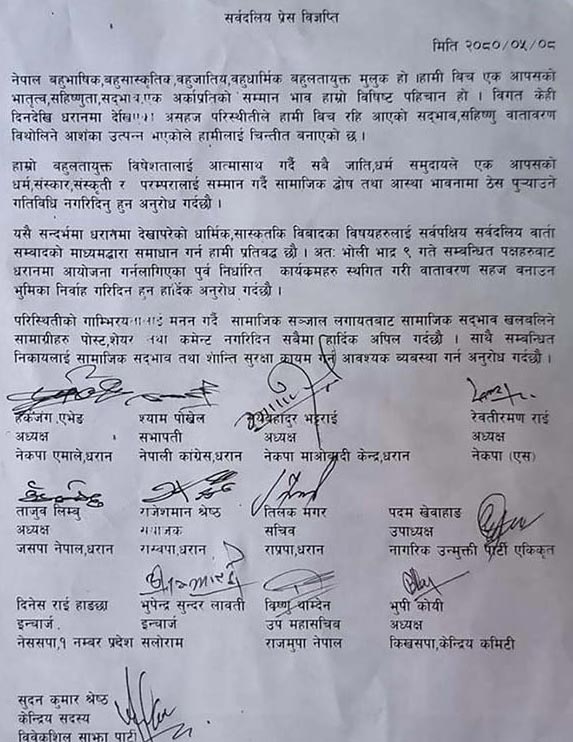 विज्ञप्तिमा भनिएको छ, ‘यसै सन्दर्भमा धरानमा देखापरेको धार्मिक, सांस्कृतिक विवादका विषयलाई सर्वपक्षीय–सर्वदलीय वार्ता संवादको माध्यमद्वारा समाधान गर्न हामी प्रतिबद्ध छौँ ।’