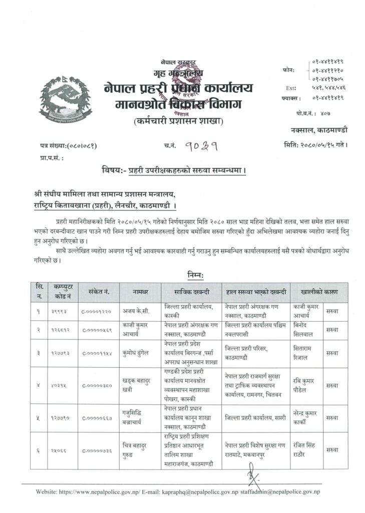 रामबहादुर केसीलाई दाङ, बासुदेव खतिवडालाई इलाम, श्यामकुमार महतोलाई प्रदेश प्रहरी जनकपुर, श्यामकृष्ण अधिकारीलाई गण्डकी प्रदेश प्रहरी गण कास्की, संजयसिंह थापालाई नुवाकोट, सरोज पौडेललाई राजमार्ग सुरक्षा ट्राफिक कार्यालय सुनसरी, सीताराम रिजाललाई मकवानपुर, सुरेशप्रसाद काफ्लेलाई बारा र होबिन्द्र बोगतीलाई केन्द्रीय अनुसन्धान व्यूरो महाराजगञ्जमा सरुवा भएको पत्रमा उल्लेख छ ।