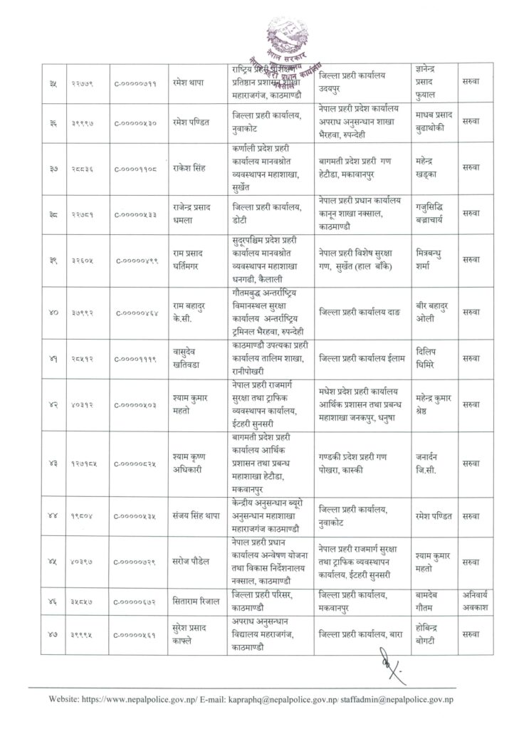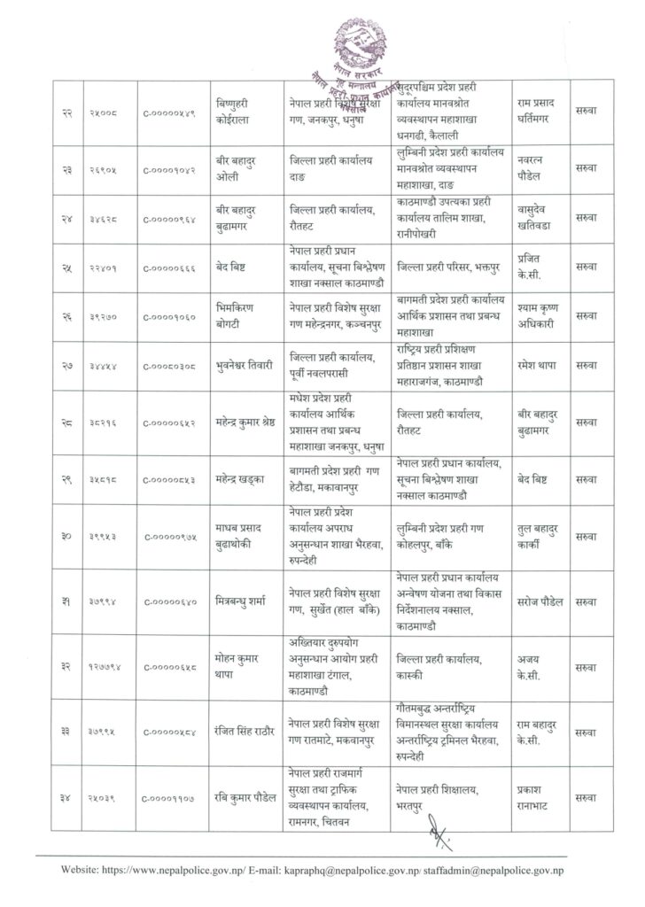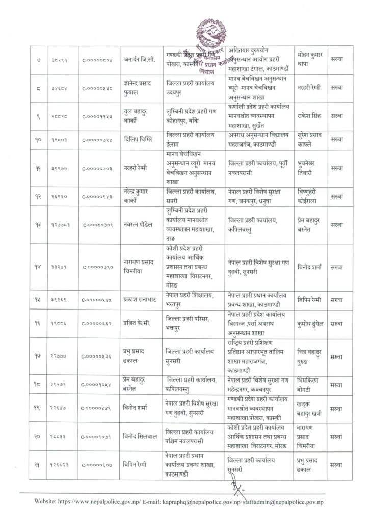 नरेन्द्रकुमार कार्कीलाई विशेष सुरक्षा गण जनकपुर, नवरत्न पौडेललाई कपिलवस्तु, नारायणप्रसाद चिमरियालाई विशेष सुरक्षागण सुनसरी, प्रकाश रानाभाटलाई प्रबन्ध शाखा नक्साल, प्रजित केसीलाई प्रदेश कार्यालय बीरगञ्ज, प्रभुप्रसाद ढकाललाई प्रतिष्ठान तालिम केन्द्र महाराजगञ्ज, प्रेमबहादुर बस्नेतलाई सुरक्षा गण महेन्द्रनगर, विनोद शर्मालाई गण्डकी प्रदेश प्रहरी, विनोद सिलवाललाई कोशी प्रदेश कार्यालय, विपिन रेग्मी सुनसरीमा सरुवा भएको छ ।