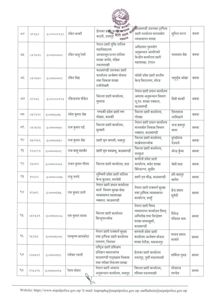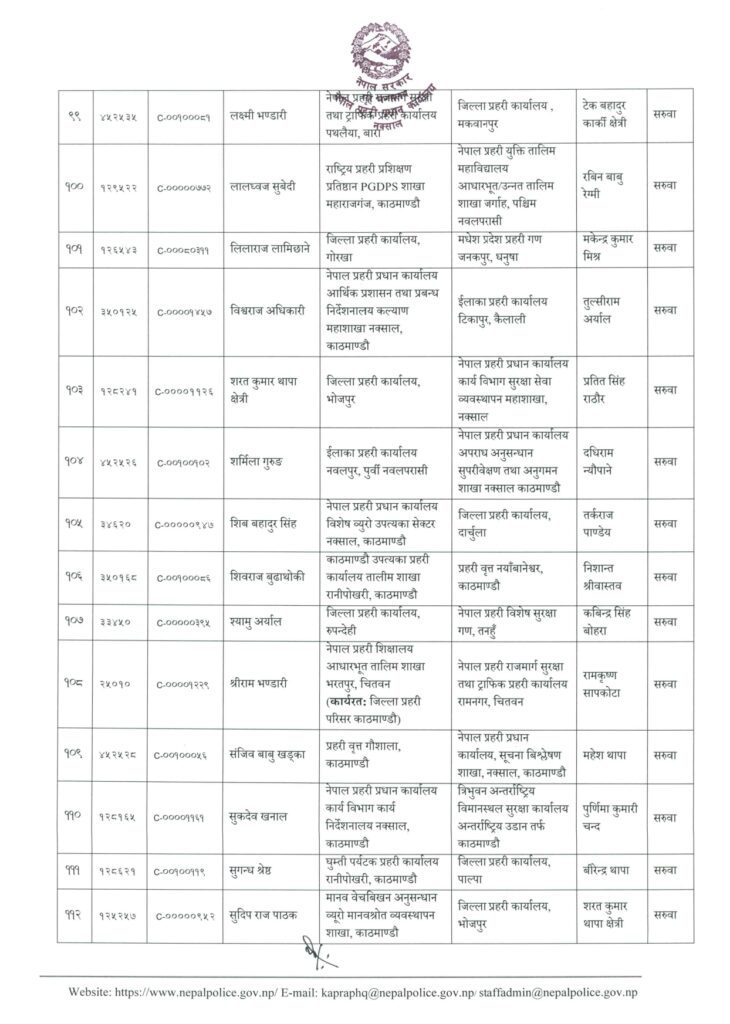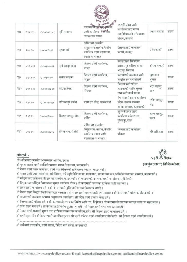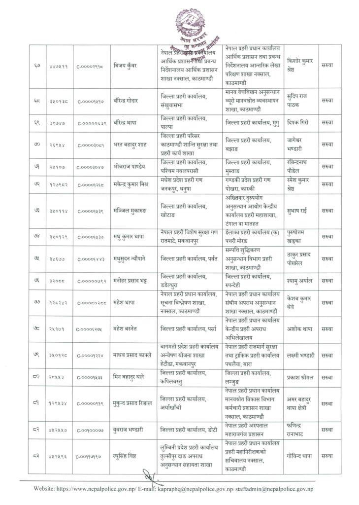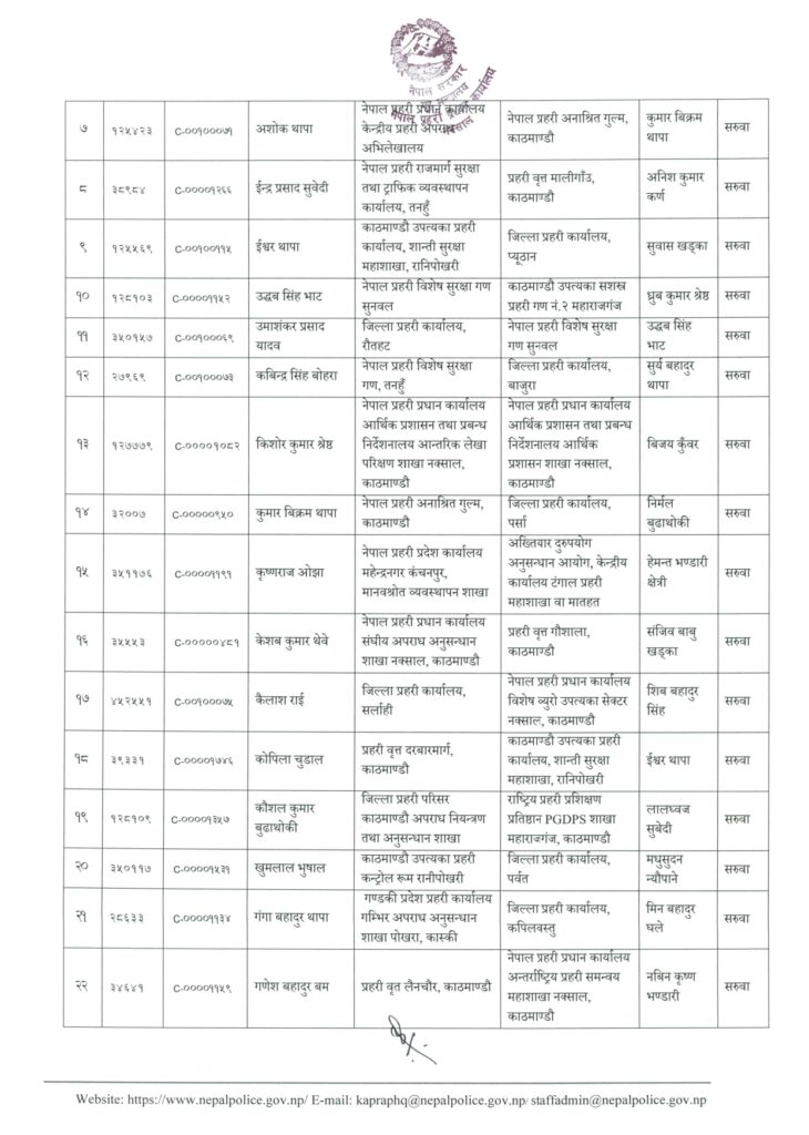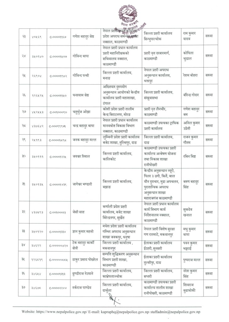 अर्जुन केसीलाई जिल्ला प्रहरी कार्यालय कालीकोट, ईन्द्रप्रसाद सुवेदीलाई प्रहरी वृत्त मालिगाउँ, ईश्वर थापालाई जिप्रका प्यूठान, कविन्द्रसिंह बोहरालाई जिप्रका बाजुरा, कुमारबिक्रम थापालाई जिप्रका पर्सा, केशवकुमार थेबेलाई प्रहरी वृत्त गौशाला, खुमलाल भुसाललाई जिप्रका पर्वत, गोविन्द थापालाई प्रहरी वृत्त दरबारमार्ग, घनश्याम श्रेष्ठलाई जिप्रका संखुवासभा, चर्तुभुज ओझालाई प्रहरी वृत्त लैनचौरमा सरुवा गरिएको छ ।
