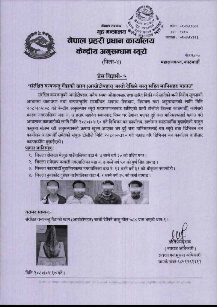 अनुसन्धानको क्रममा खुल्न आएका थप दुई जना मानिसहरूलाई व्यूरो तथा वनको संयुक्त टोलीले भदौ १० गते पक्राउ गरि डिभिजन वन कार्यालय हात्तीसार काठमाडौंमा बुझाइएको छ ।