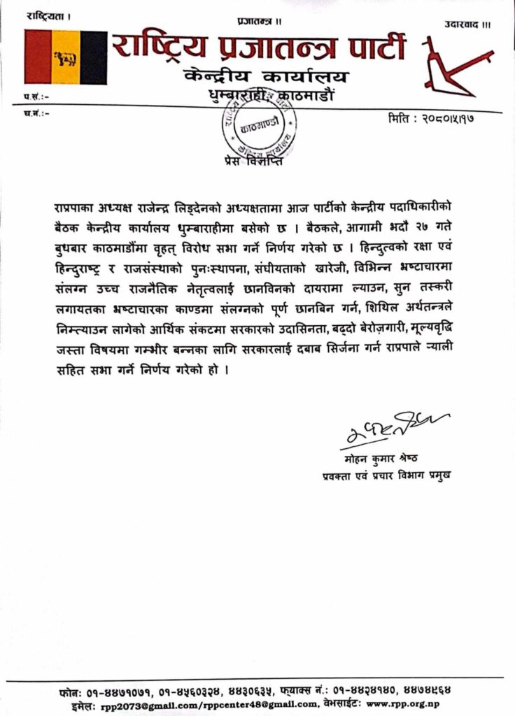 आइतबार काठमाडौंको धुम्बाराहीस्थित पार्टी केन्द्रीय कार्यालयमा बसेको राप्रपा पदाधिकारीको बैठकले भदौ २७ गते बुधबार काठमाडौंमा वृहत् विरोध सभा गर्ने निर्णय गरेको प्रवक्ता मोहन श्रेष्ठले बताएका छन् ।