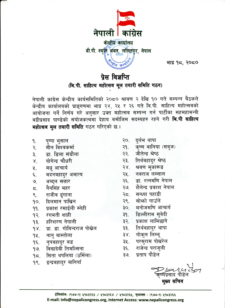 काठमाडौं । नेपाली कांग्रेसले वीपी साहित्य महोत्सव मूल तयारी समिति गठन गरेको छ ।
