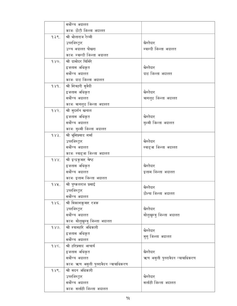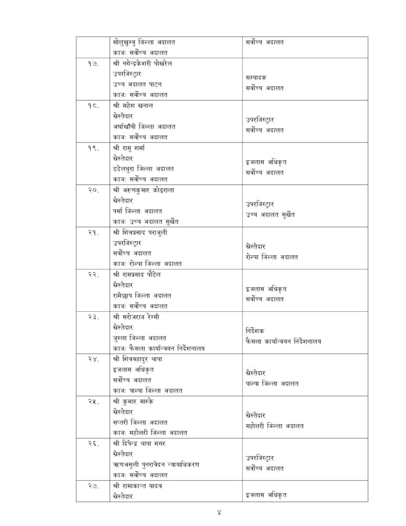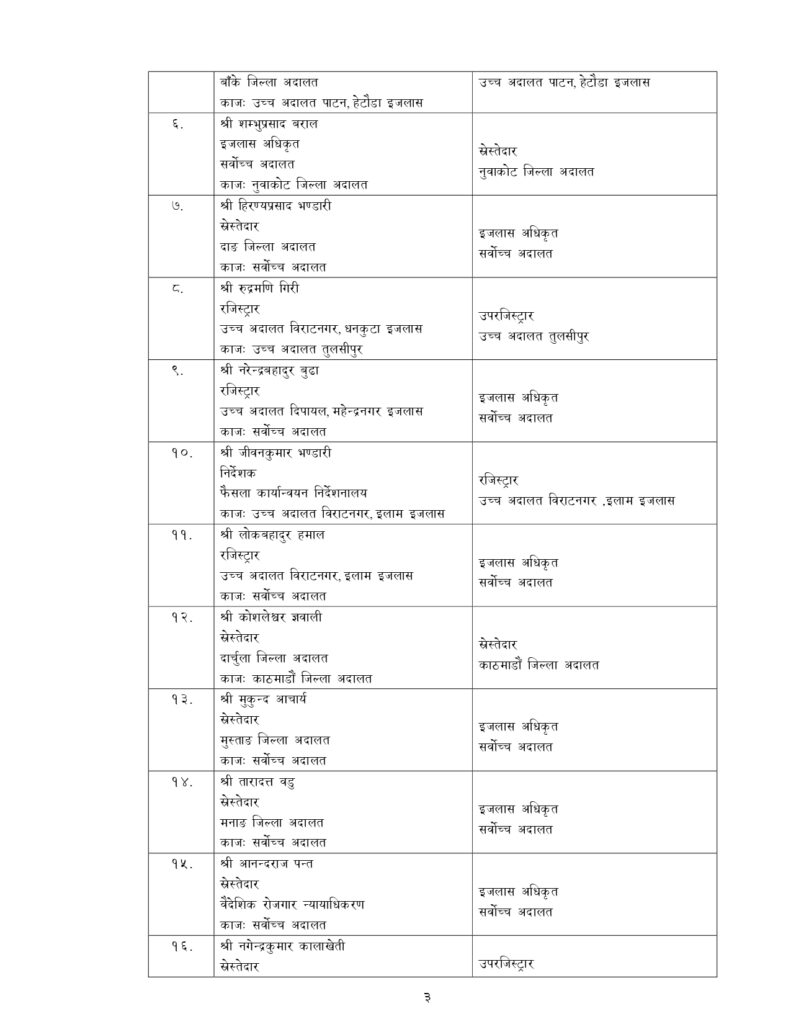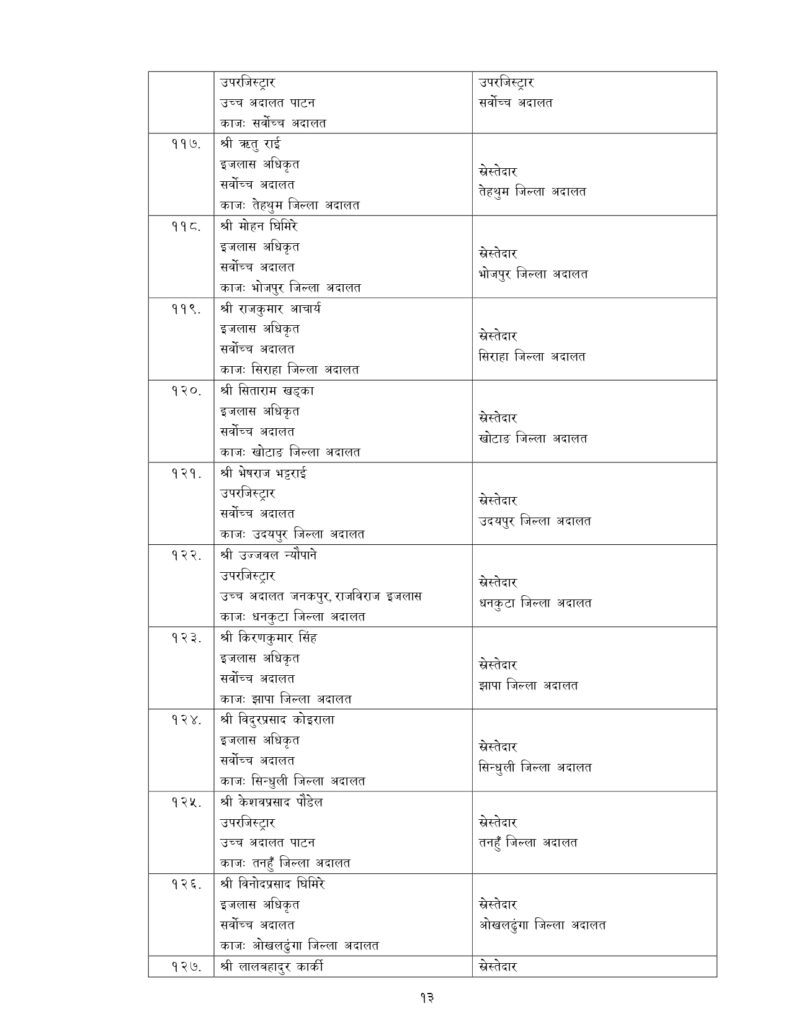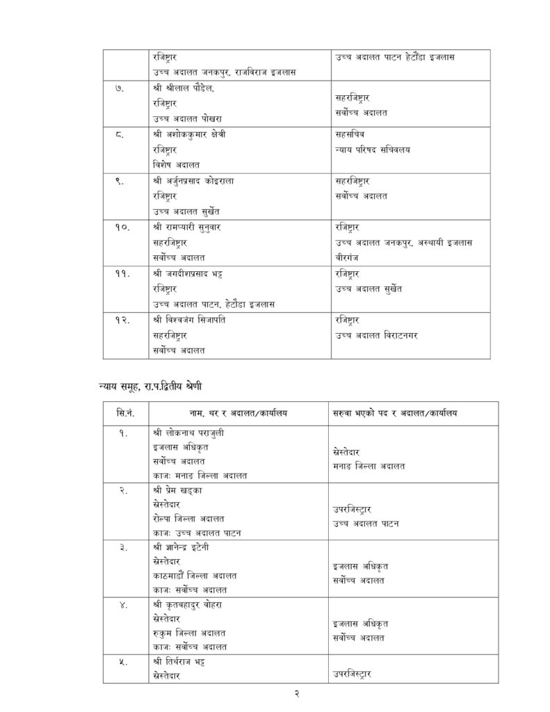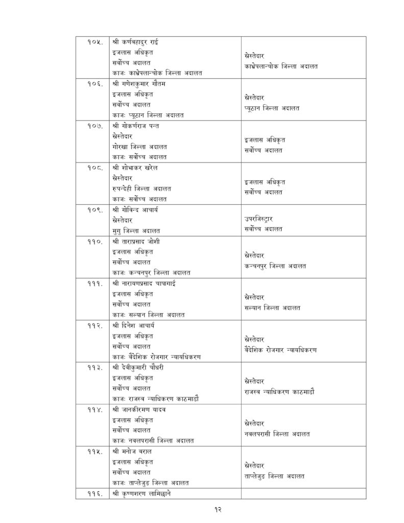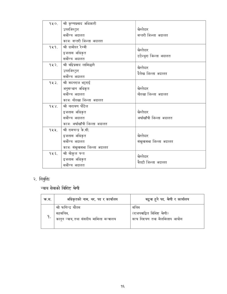 न्याय सेवामा कार्यरत १२ जना सह–सचिव, १५६ जना उप–सचिवको पनि सरुवा भएको छ ।