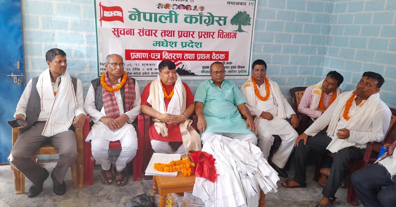 शुक्रबार जनकपुरधामस्थित पार्टीको प्रदेश कार्यालयमा आयोजना गरिएको कार्यक्रममा नेपाली कांग्रेस मधेश प्रदेशका सभापति तथा मधेश प्रदेशका भौतिक पुर्वाधार विकासमन्त्री कृष्णप्रसाद यादवले विभागका पदाधिकारी र सदस्यहरूलाई प्रमाणपत्र वितरण गरेका छन् ।