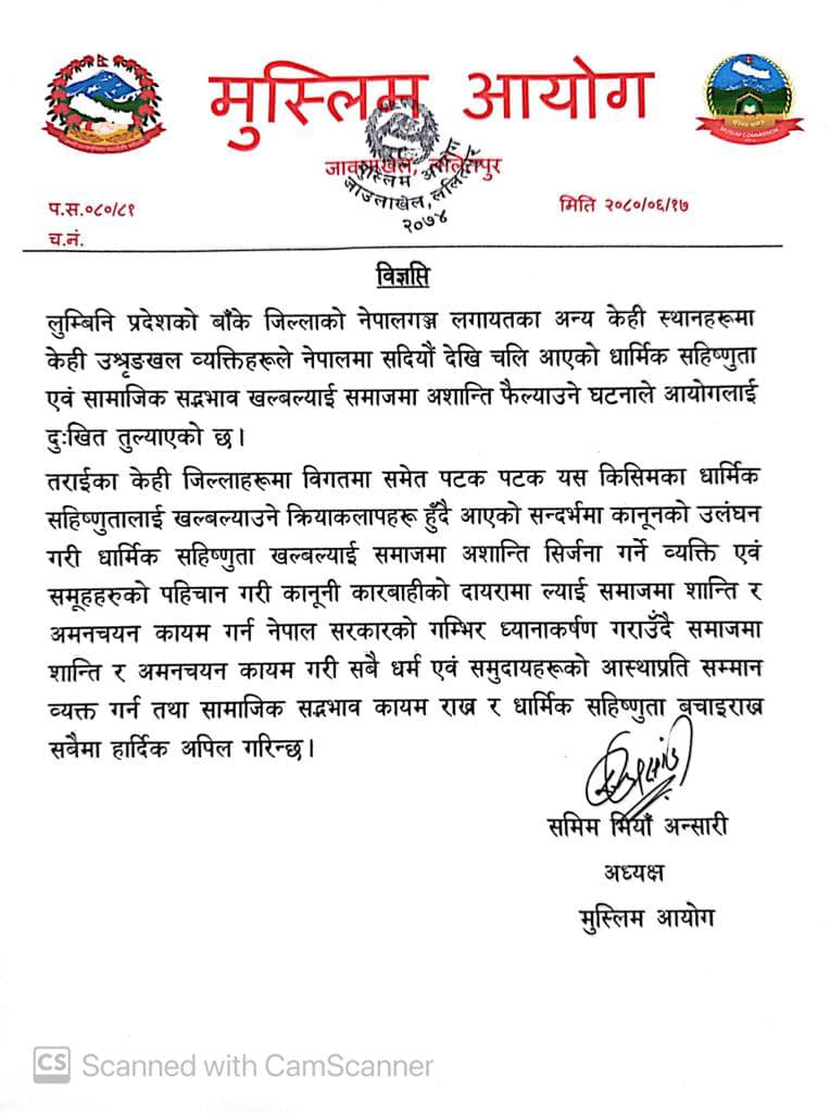 काठमाडौं । मुस्लिम आयोगका अध्यक्ष समिम मियाँ अन्सारीले नेपालगञ्ज लगायत केही स्थानमा भएका उश्रृङखल