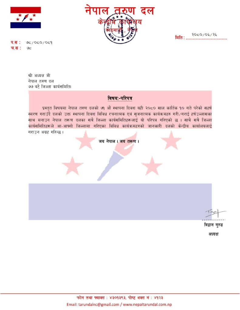 अध्यक्ष गुरुङले सबै जिल्ला कार्यसमितिहरूलाई परिपत्र गरेर कात्तिक १० गते नेपाल तरुण दलको स्थापना दिवस विशेष कार्यक्रम गरेर मनाउन आग्रह गरेका हुन् ।