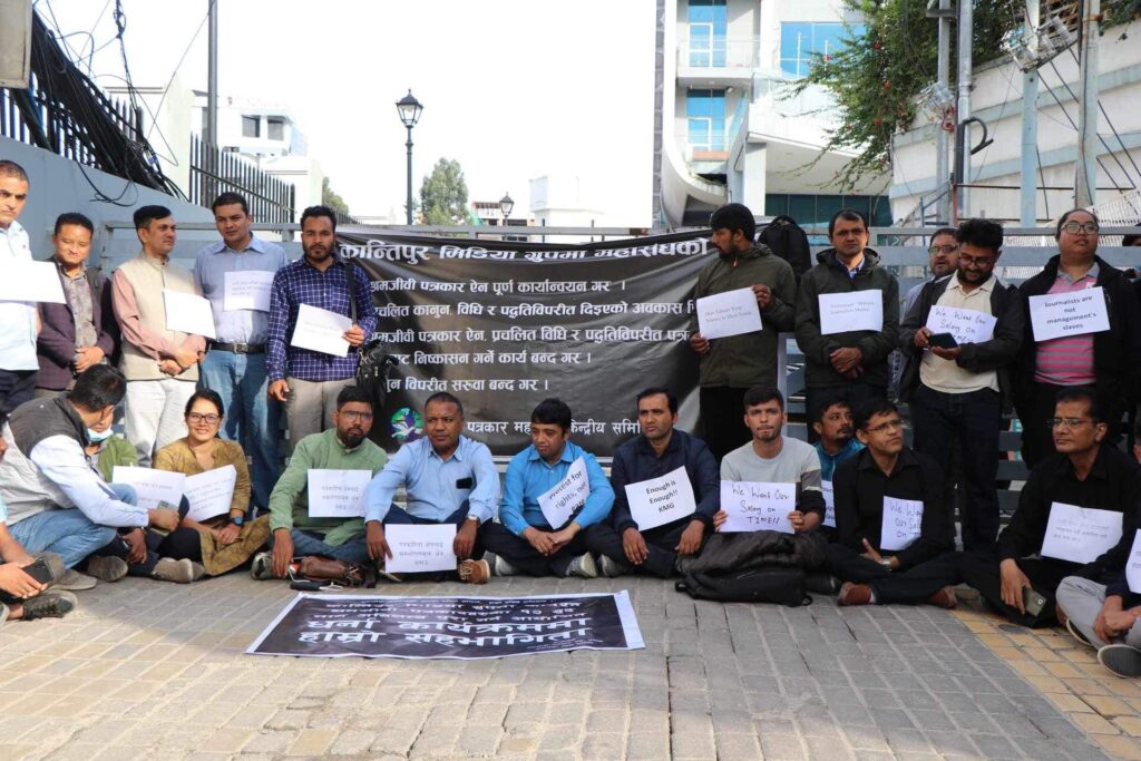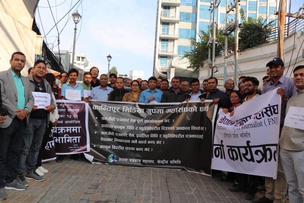 मंगलबार काठमाडौंको थापाथलिस्थित कान्तिपुर दैनिकको मुख्यालयमा पत्रकार महासंघका वरिष्ठ उपाध्यक्ष रमेश विष्ट, महासचिव रोशन पुरी, श्रमजीवी पत्रकार संघ नेपालका अध्यक्ष जन्मदेव जैशी लगायतका पत्रकार र कर्मचारीहरूले धर्नासहितको प्रदर्शन गरेका हुन् ।