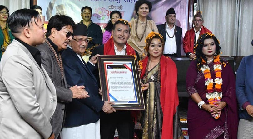 एमालेका अध्यक्ष ओलीद्वारा युवा व्यवसायी प्रकाश र वरिष्ठ सौन्दर्यविद् रश्मिलालाई सम्मान