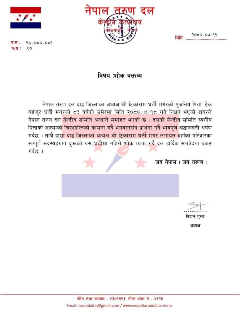 तरुण दल दाङका अध्यक्ष घर्तीका पिताको निधन, गुरुङद्वारा शोक व्यक्त