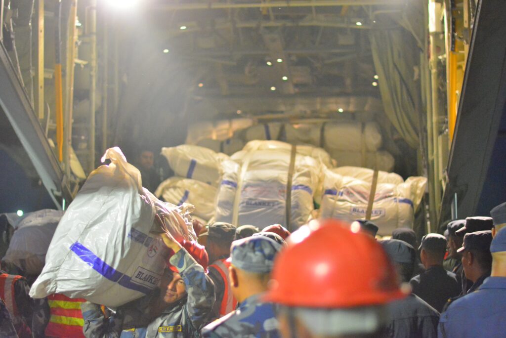 भारतले ल्याइदियो जहाजमा दोस्रो खेप राहत, औषधि, त्रिपाल, स्लीपिङ्ग ब्याग, कम्बलसहित ९ टन सामान
