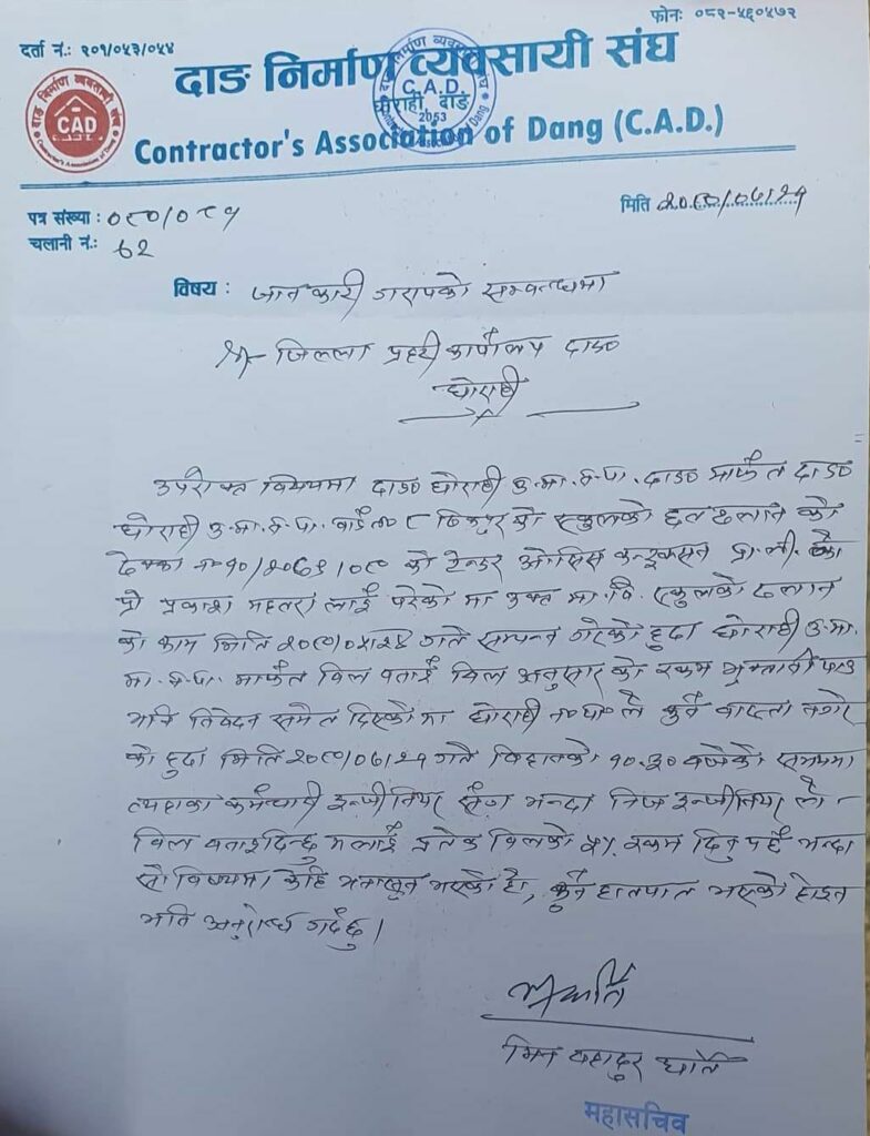मंगलबार संघका महासचिव मीनबहादुर घर्तीले जिल्ला प्रहरी कार्यालय दाङमा जानकारी पत्र लेखेर काम गरेको रकमको भुक्तानी माग गर्दा घोराही उप–महानगरपालिकाका ईन्जिनियरले प्रत्येक बिलको ५ प्रतिशत रकम माग गरेको जनाएका छन् ।