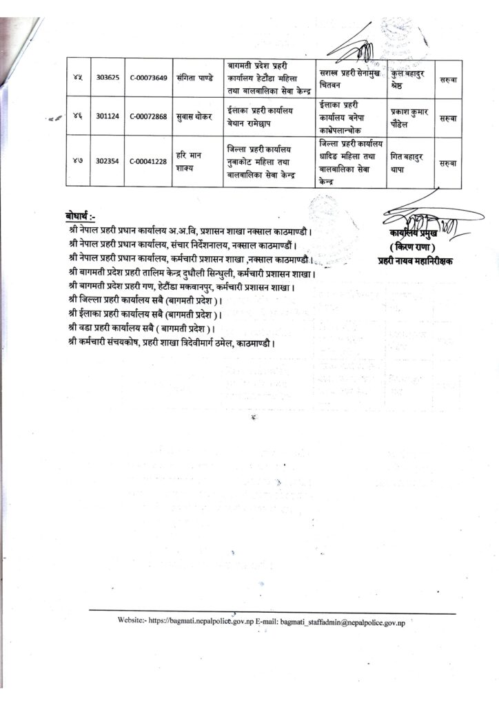 बागमती प्रदेश प्रहरी कार्यालयले बिहीबार सूचना जारी गरेर ४७ जना नायव निरीक्षकहरूको सरुवा गरिएको जनाएको छ ।