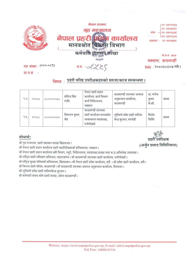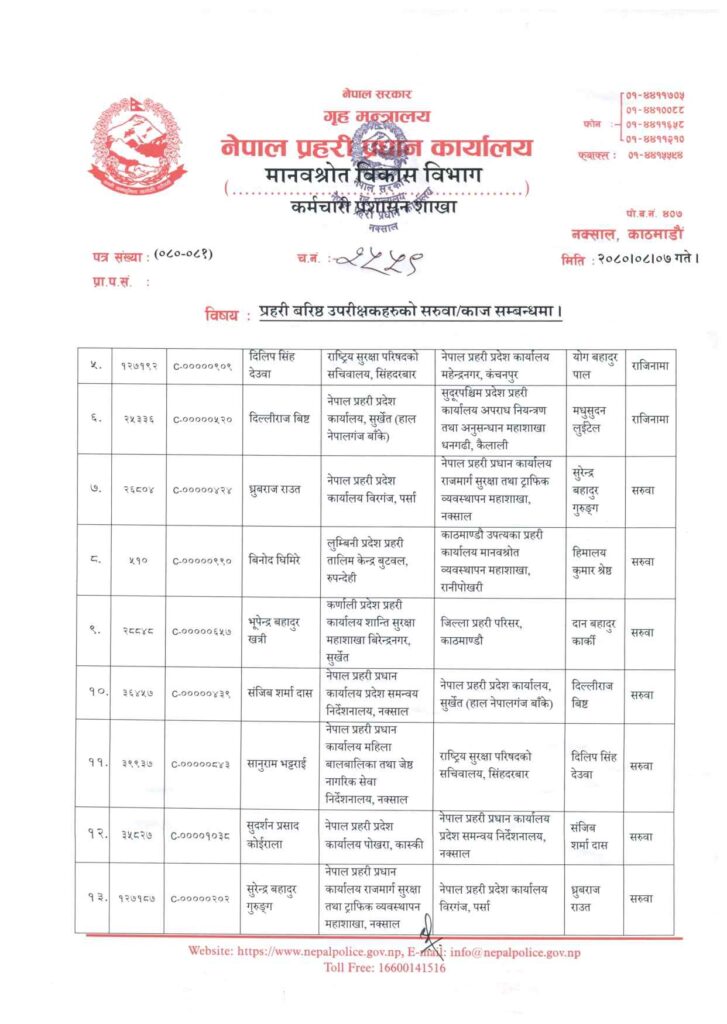 काठमाडौं । नेपाल प्रहरीको प्रहरी प्रधान कार्यालय नक्सालले १५ जना प्रहरी वरिष्ठ उपरीक्षक (एसएसपी)को सरूवा र काज गरेको छ ।