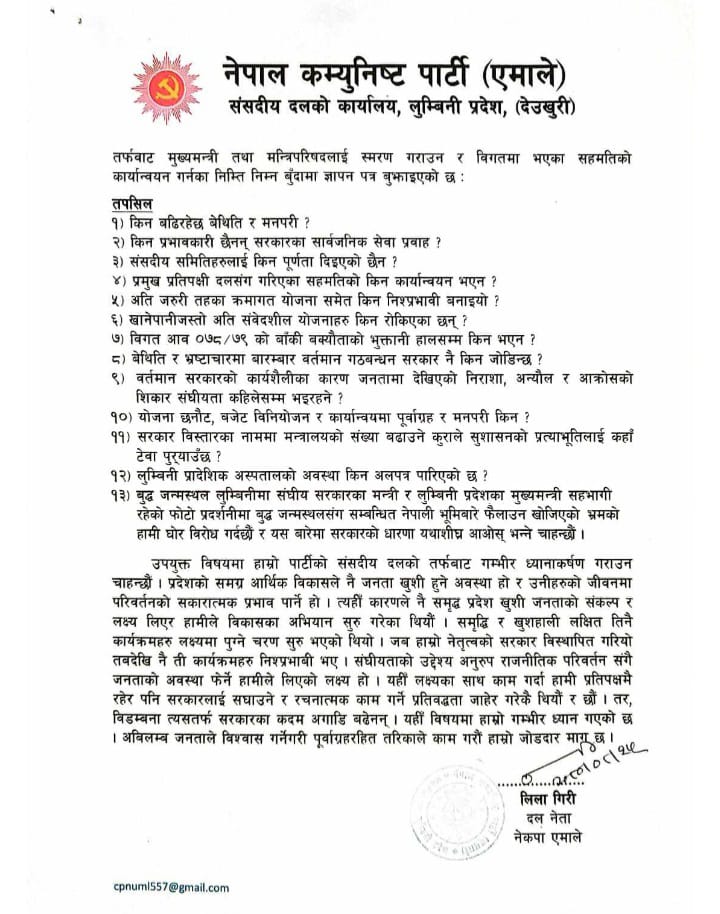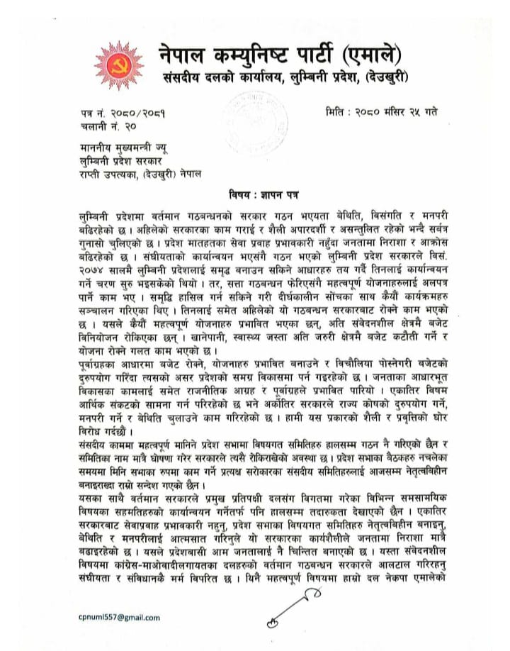 देउखुरी । विभिन्न आरोपहरूसहित एमालेले लुम्बिनी प्रदेश सरकारमाथि दवाव सिर्जना गर्न शुरु गरेको छ ।