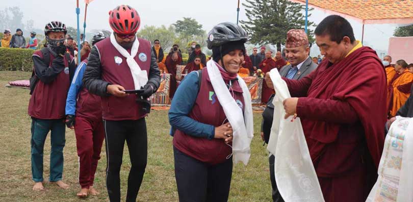 बुद्ध ज्ञान साइकल यात्राका यात्रीहरुलाई उपाध्यक्ष डा. लामाद्वारा लुम्बिनीमा स्वागत