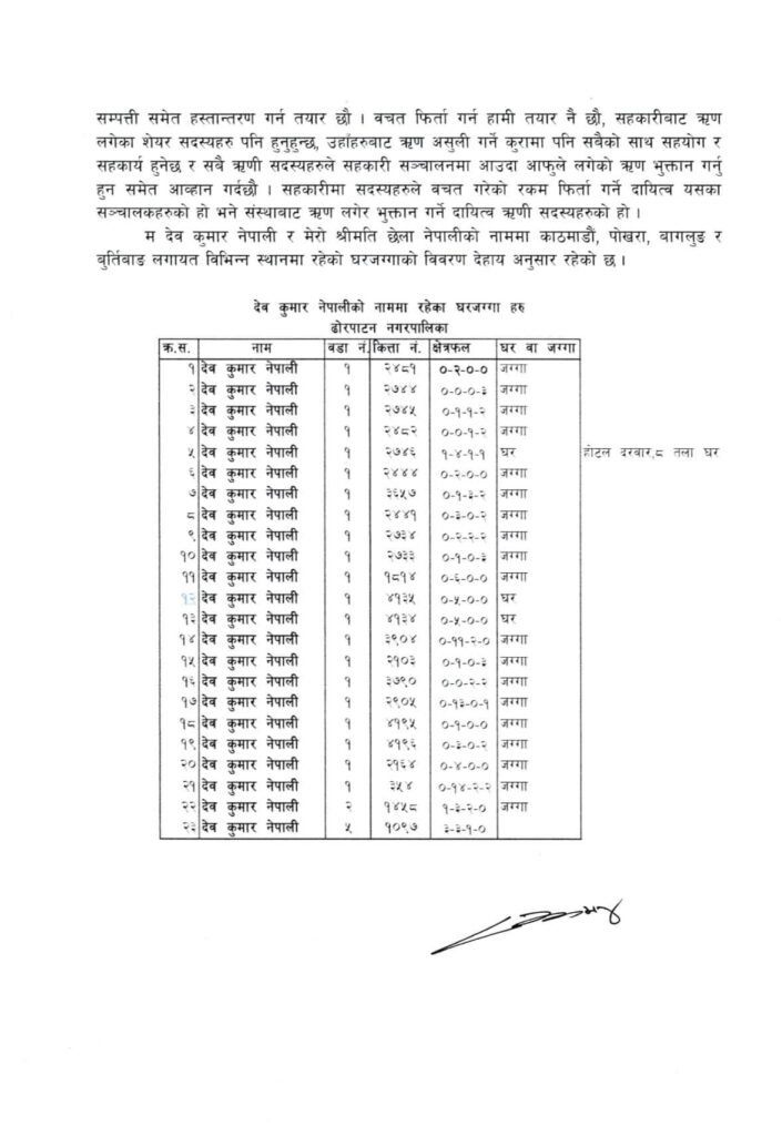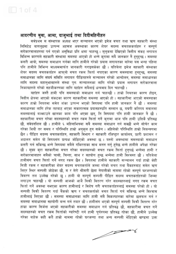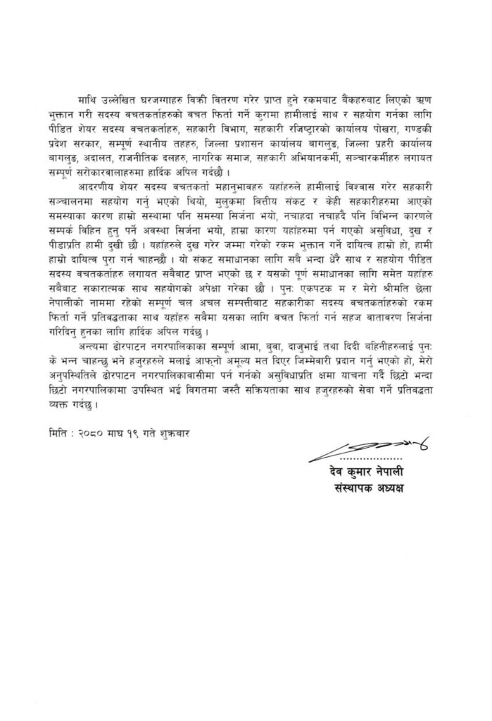 माघ १९ अपिल सार्वजनिक गर्दै आफू र आफ्नो श्रीमती छेला नेपालीको नाममा रहेको सम्पूर्ण सम्पत्ति सहकारी पीडितको नाममा गरिदिने बताएका छन् ।
