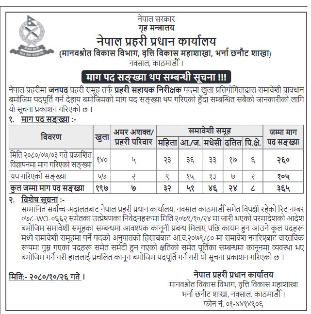 शुक्रवार सूचना जारी गर्दै नेपाल प्रहरीले ठूलो संख्यामा भर्नाका लागि आवेदन माग गरेको छ ।