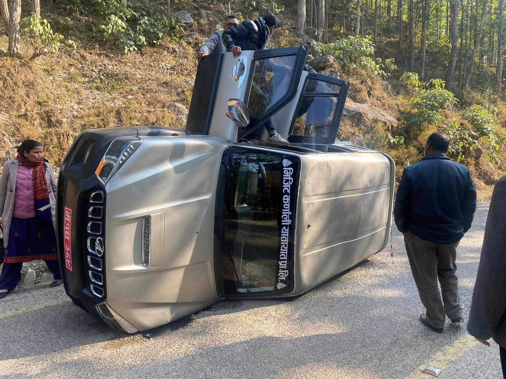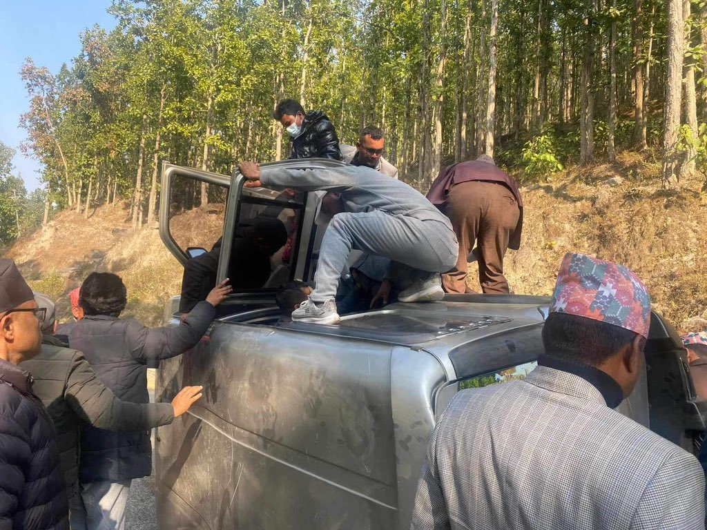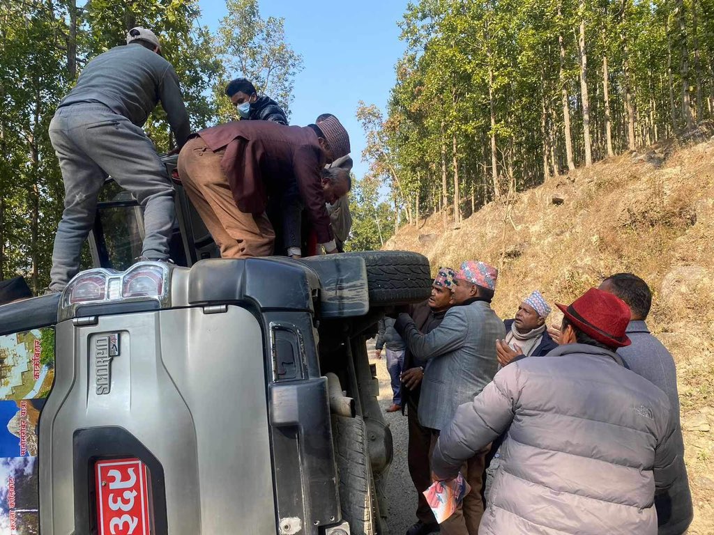 नेकपा (एमाले)को दैलेख जिल्ला अधिवेशन उद्घाटन गर्न जान लाग्दा डुंगेश्वर गाउँपालिका– १ चुप्रानजिकै पोखरेल सवार गाडी सडकमा पल्टेको थियो ।