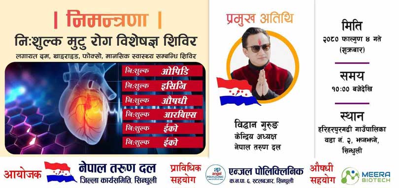 नेपाल तरुण दल सिन्धुली जिल्ला कार्यसमितिले फागुन ४ गते हरिहरपुरगढी गाउँपालिकाको वडा नं. २ झनझनेमा आयोजना गर्न लागेको नि:शुल्क मुटु रोग विशेषज्ञ स्वास्थ शिविरको कार्यक्रममा सहभागी हुन अध्यक्ष गुरुङ सिन्धुली जान लागेका हुन् ।