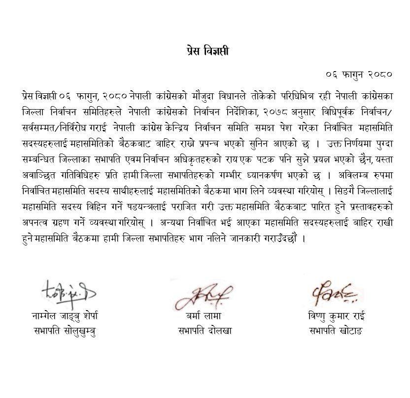 कांग्रेसको मौजुदा विधानले तोकेको परिधिभित्र रही नेपाली कांग्रेसका जिल्ला निर्वाचन समितिहरूले नेपाली कांग्रेसको निर्वाचन निर्देशिका, २०७८ अनुसार विधिपूर्वक निर्वाचन/सर्वसम्मत/निर्विरोध गराई नेपाली कांग्रेस केन्द्रीय निर्वाचन समिति समक्ष पेश गरेका निर्वाचित महासमिति सदस्यहरूलाई महासमितिको बैठकबाट बाहिर राख्ने प्रपञ्च भएको सुनिएको तीन जिल्लाका सभापतिहरूले जनाएका छन् ।