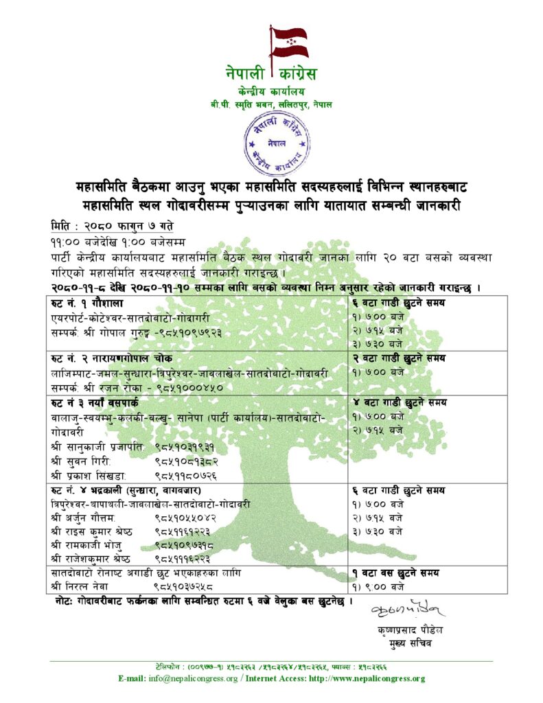 कांग्रेसले महासमिति बैठकस्थल गोदावरी जान र आउनका लागि २० वटा बसको व्यवस्था गरिएको विज्ञप्तिमार्फत जनाएको छ ।