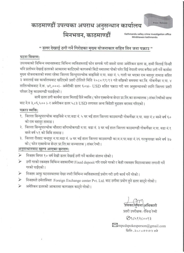 उपत्यकाको विभिन्न स्थानहरुबाट विभिन्न व्यक्तिहरुलाई फोन सम्पर्क गरी सस्तो दरमा अमेरिकन डलर छ भनेर ठगी गर्ने गिरोहका नाइके रामबहादुर तामाङलाई पक्राउ गरेको काठमाडौं उपत्यका अपराध अनुसन्धान कार्यालय मीनभवनले विज्ञप्तिमार्फत जनाएको छ । उनीसँग पक्राउ पर्नेमा सिन्धुपाल्चोकका बीबी तामाङ र रौतहटका शंकर रेग्मी पनि रहेका छन् ।