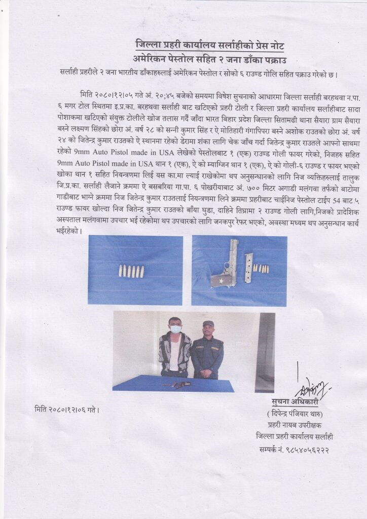 काठमाडौं । जिल्ला प्रहरी कार्यालय सर्लाहीले अमेरिकन पेस्तोलसहित दुई जना भारतीय डाँकालाई पक्राउ गरेको छ ।