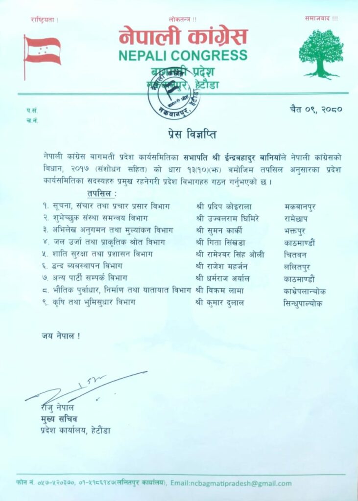 सभापति बानियाँद्वारा बागमती कांग्रेसका ९ विभागहरूमा प्रमुखहरू मनोनीत