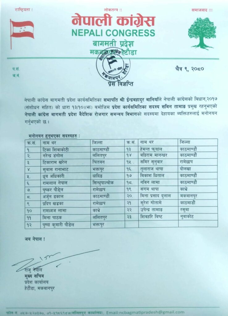 बागमती कांग्रेसको वैदेशिक रोजगार समन्वय विभागमा सदस्यहरू मनोनयन
