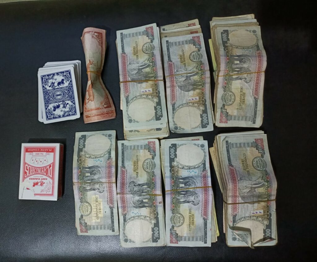 जुवातास खेली रहेको स्थानबाट १० जना पुरुष व्यक्तिहरूसहित दुई लाख छ हजार सात सय पच्चीस रुपियाँ, तास २ (दुई) बुक समेत बरामद भएको छ ।