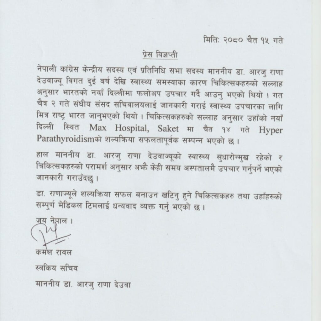 भारतको राजधानी नयाँदिल्लीस्थित म्याक्स हस्पिटल, स्केटमा बुधबार हाइपर पाराथाइइडिजमको शल्यक्रिया सफलताका साथ सम्पन्न भएको छ ।
