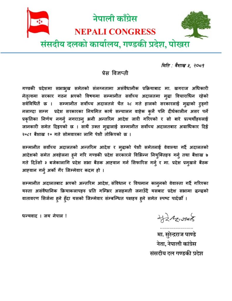 नेपाली कांग्रेस गण्डकी प्रदेश संसदीय दलका नेता पाण्डेले बुधबार विज्ञप्तिमार्फत भनेका छन्, ‘सम्मानित अदालतबाट भएको अन्तरिम आदेश, संविधान र विद्यमान कानूनको बेवास्ता गर्दै संसद् अधिवेशन आह्वान गर्नु असंवैधानिक कार्य हो ।’
