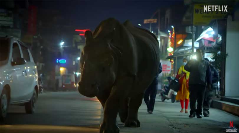सौराहामा गैंडा हिँडेको चितवनको दृश्य अब सडकमा मात्र सीमित रहेन । नेटफिल्क्सले समेत राखेको छ ।