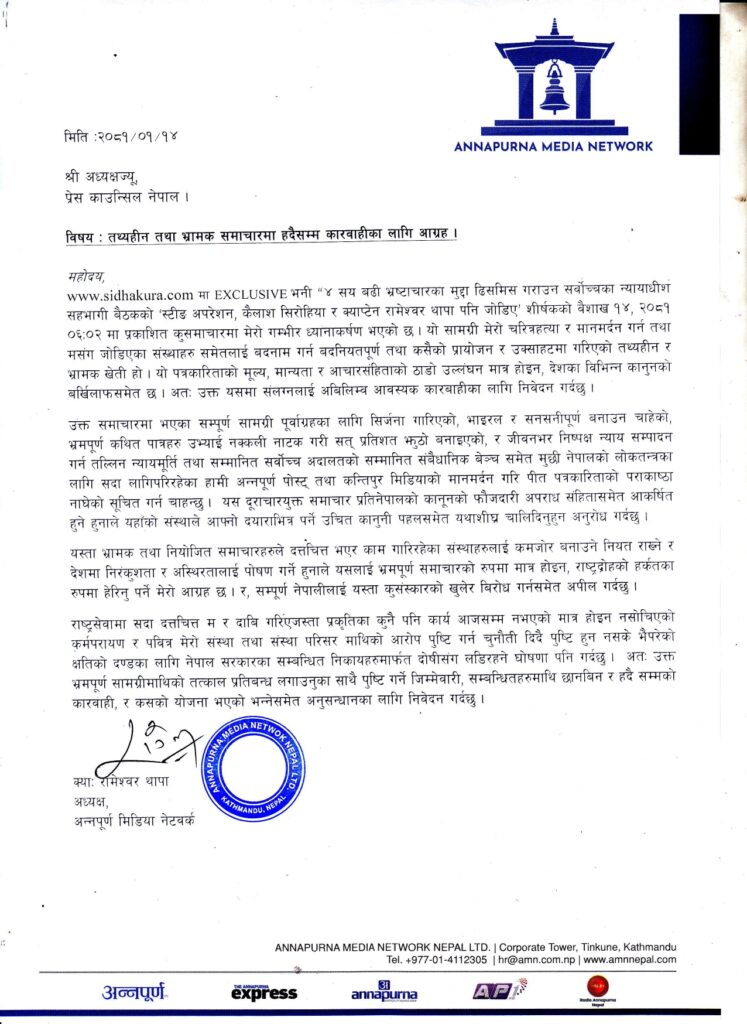 उनले भने, ‘समाचारमा भएका सम्पूर्ण सामग्री पूर्वाग्रहका लागि सिर्जना गरिएको, भाइरल र सनसनीपूर्ण बनाउन चाहेको भ्रामपूर्ण कथित पात्रहरू उभ्याइ नक्कली नाटक गरी सत् प्रतिशत झुठो बनाइएको र जीवनभर निष्पक्ष न्याय सम्पादन गर्न तल्लीन न्यायमूर्ति तथा सम्मानित सर्वोच्च अदालतको सम्मानित संवैधानिक बेञ्च समेत मुछी नेपालको लोकतन्त्रका लागि सदा लागिपरिरहेका हामी अन्नपूर्ण पोस्ट् तथा कान्तिपुर मिडियाको मानमर्दन गरि पित पत्रकारिताको पराकाष्ठा नाघेको सूचित गर्न चाहन्छु ।’