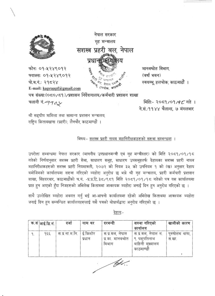 डीआईजी ई.किशोर प्रधानलाई पशुपतिनाथ बाहिनी मुख्यालय काठमाडौंमा सरुवा गरिएको छ । श्रेष्ठ यसअघि सशस्त्र प्रहरी मुख्यालयको मानव स्रोत विभागमा थिए ।
