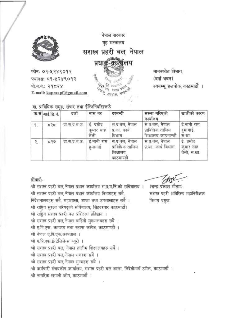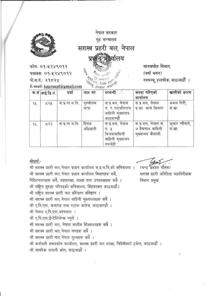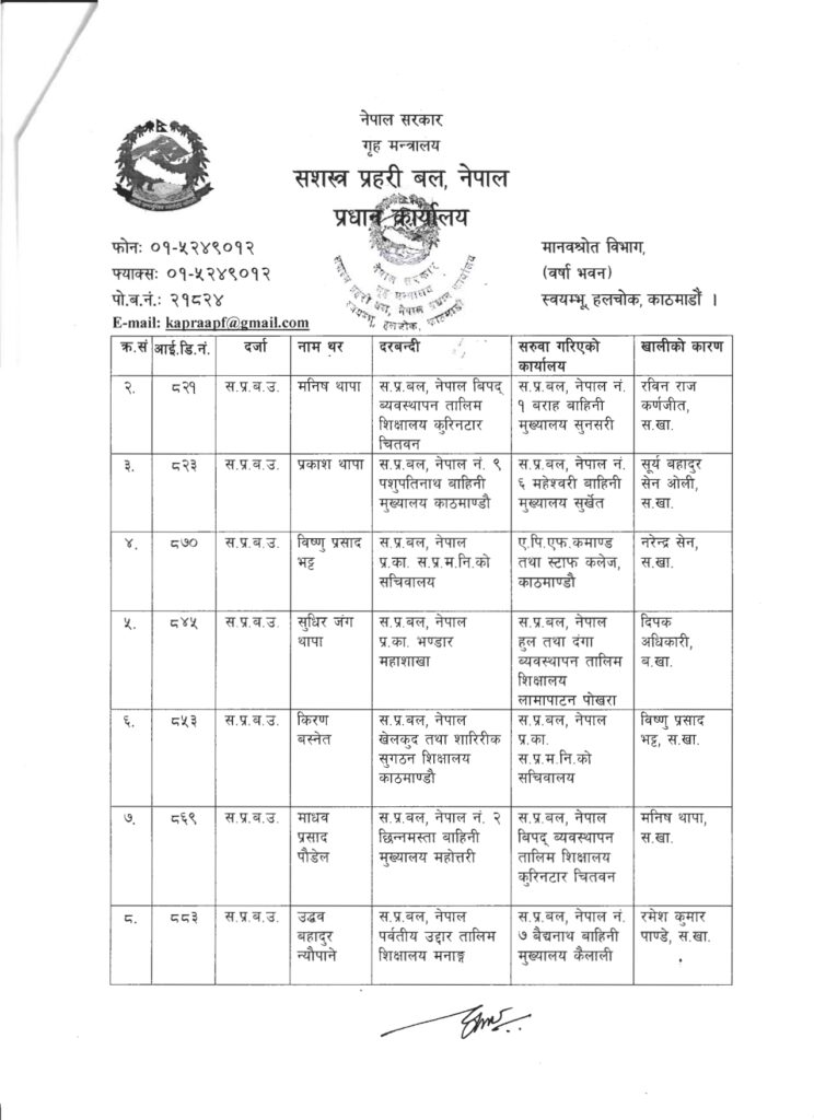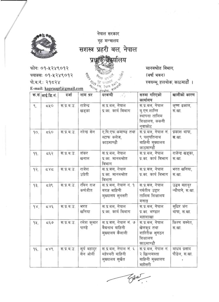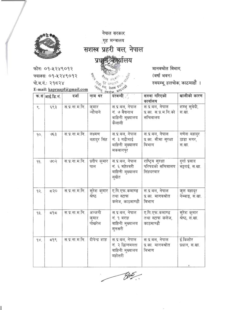 डीआइजी प्रदीपकुमार पालको राष्ट्रिय सुरक्षा परिषदको सचिवालय, सुरेशकुमार श्रेष्ठको मानवश्रोत विभाग, अञ्जनीकुमार पोखरेलको स्टाफ कलेल, पुरुषोत्तम थापाको कार्य विभाग र दीपक अधिकारीको बैद्यनाथ बाहिनी कैलालीमा सरुवा भएको सूचनमा उल्लेख छ ।