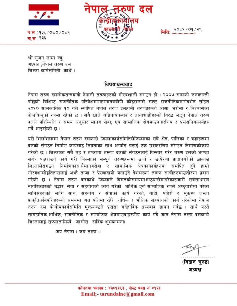 शनिबार धन्यवाद पत्र लेखेर तरुण दल काभ्रेका अध्यक्ष सुजन लामालाई अध्यक्ष गुरुङले संगठन निर्माण, सामाजिककार्य लगायतका कार्य गरेको भन्दै धन्यवाद दिएका हुन् ।