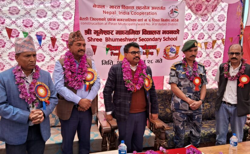 पाटन नगरपालिकाका मेयर गौरीसिंह रावल र काठमाडौंस्थित भारतीय राजदूतावासका प्रथम सचिव अविनाशकुमार सिंहले ‘नेपाल–भारत विकास सहकार्य’अन्तर्गत भारत सरकारको नेरु. ३.१०५ करोड आर्थिक सहयोगमा नेपालको बैतडी जिल्लाको पाटन नगरपालिका–४ मा निर्माण हुने श्री भूमेश्वर माध्यमिक विद्यालयको विद्यालय भवनको संयुक्त रुपमा शिलान्यास गरिएको छ ।