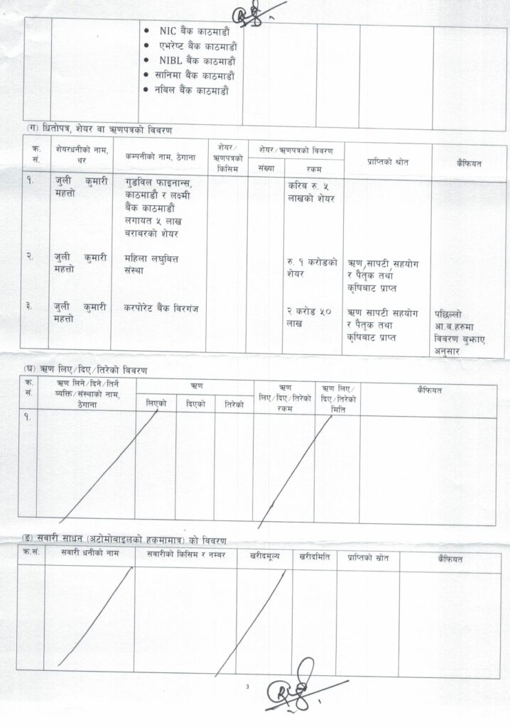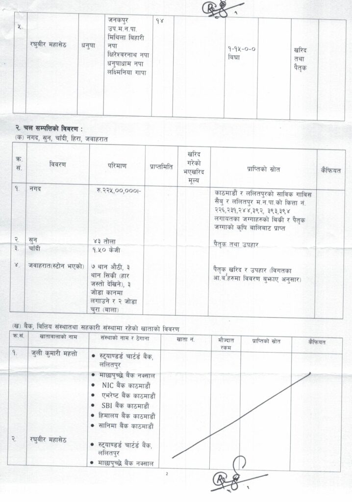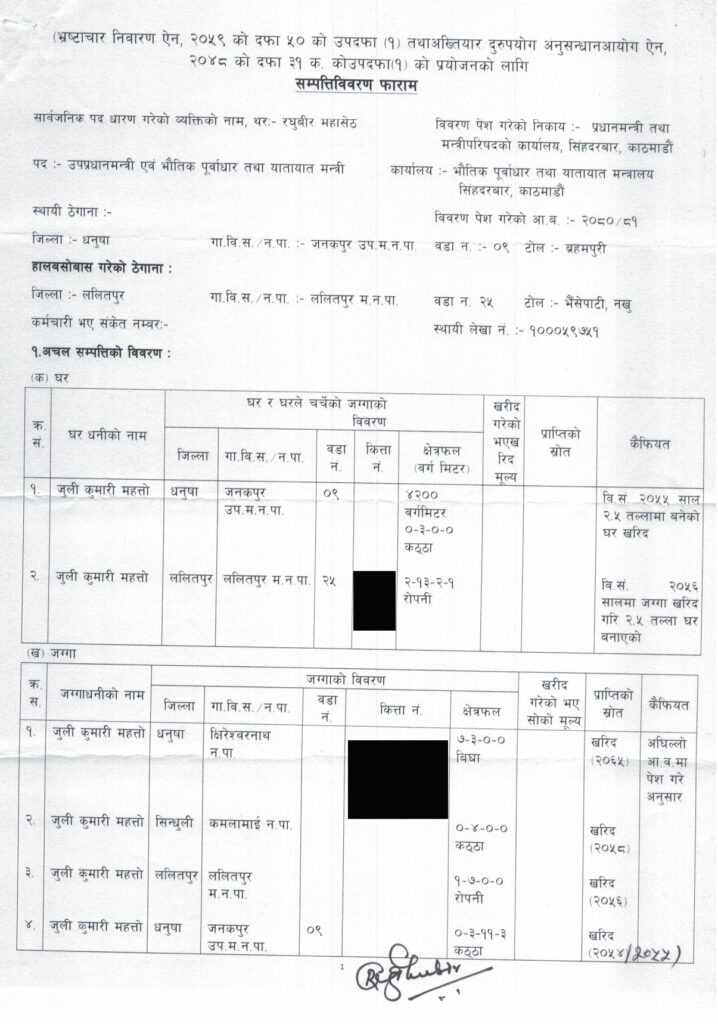 जुलीकुमारीको नाममा धनुषामा ७ बिघा ३ कठ्ठा, सिन्धुलीमा ४ कठ्ठा, ललितपुरमा १ रोपनी ७ आना, धनुषामा ३ कठ्ठा ११ धुर रहेको विवरणमा उल्लेख छ ।