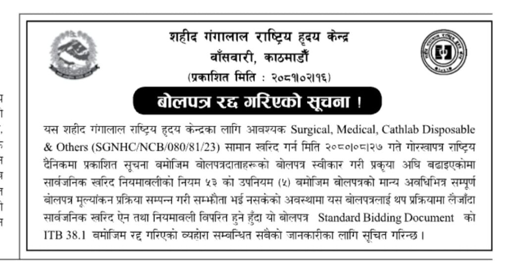 बोलपत्र रद्द भएको सूचनामा भनिएको छ, ‘यस शहीद गंगालाल राष्ट्रिय हृदय केन्द्रका लागि आवश्यक सर्जिकल, मेडिकल, क्याथल्याब डिस्पोजेबल र अन्य (एसजीएनएचसी/एनसीबी/०८०/०८१/२३) सामान खरिद गर्न मिति २०८०/०८/२७ गतेको गोरखापत्र राष्ट्रिय दैनिक प्रकाशित सूचना बमोजिम बोलपत्रदाताहरूको बोलपत्र स्वीकार गरी प्रकृया अघि बढाइएकोमा सार्वजनिक खरिद नियमावलीको नियम ५३ को उपनियम (५) बमोजिम बोलपत्रको मान्य अवधिभित्र सम्पूर्ण बोलपत्र मूल्याङ्कन प्रक्रिया सम्पन्न गरी सम्झौता भइनसकेको अवस्थामा यस बोलपत्रलाई थप प्रक्रियामा लैजाँदा सार्वजनिक खरिद ऐन तथा नियमावली विपरित हुने हुँदा यो बोलपत्र स्ट्यार्ण्ड बिडिङ डकुमेन्ट को आईटीबी ३८.१ बमोजिम रद्द गरिएको व्यहोरा सम्बन्धित सबैको जानकारीका लागि सूचित गरिन्छ ।’