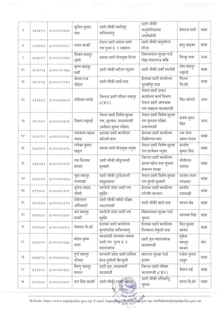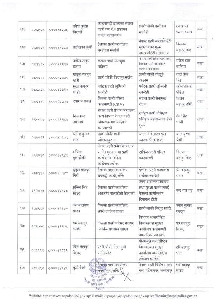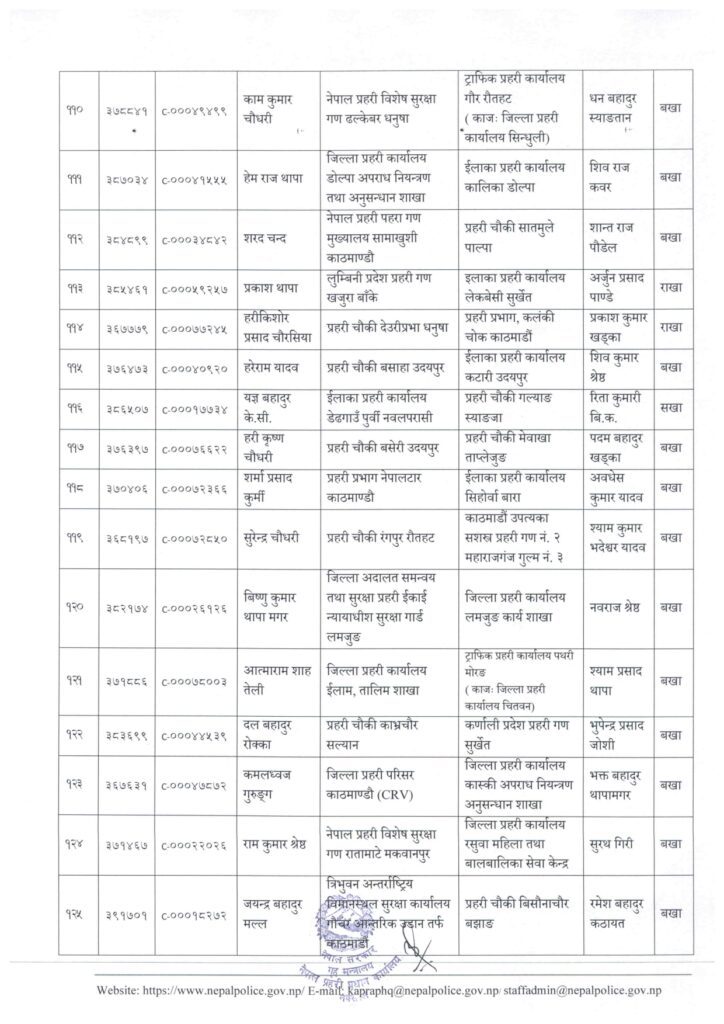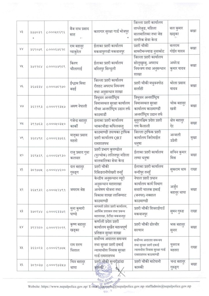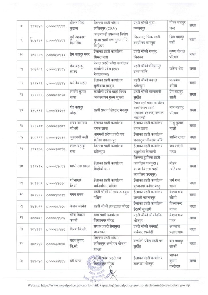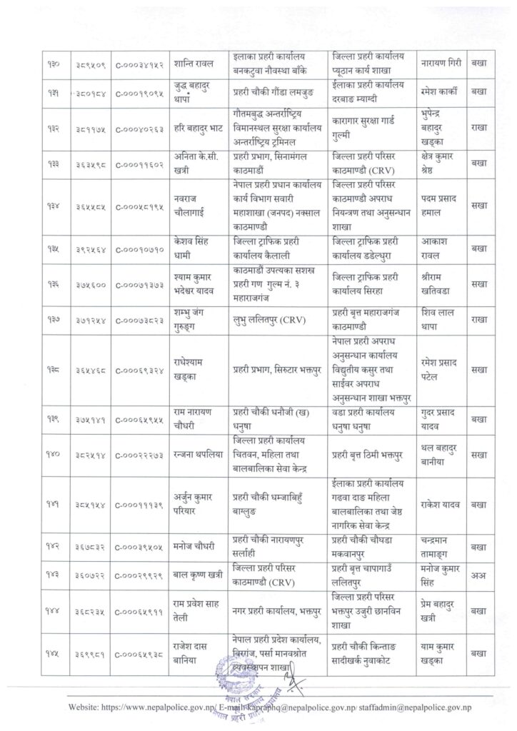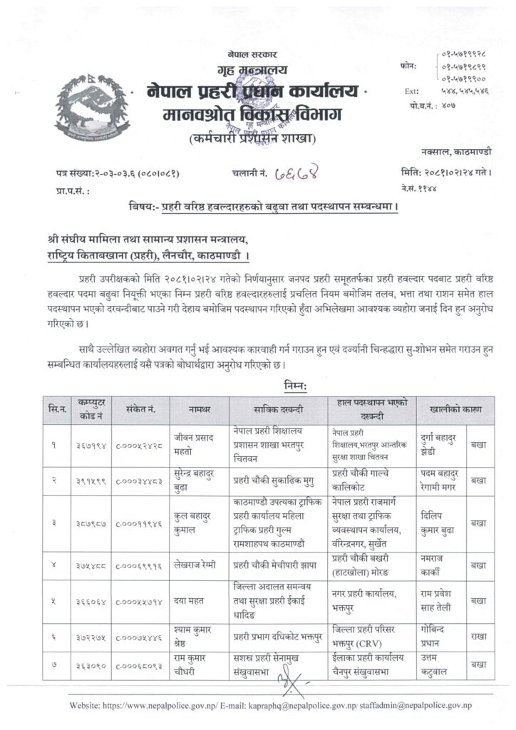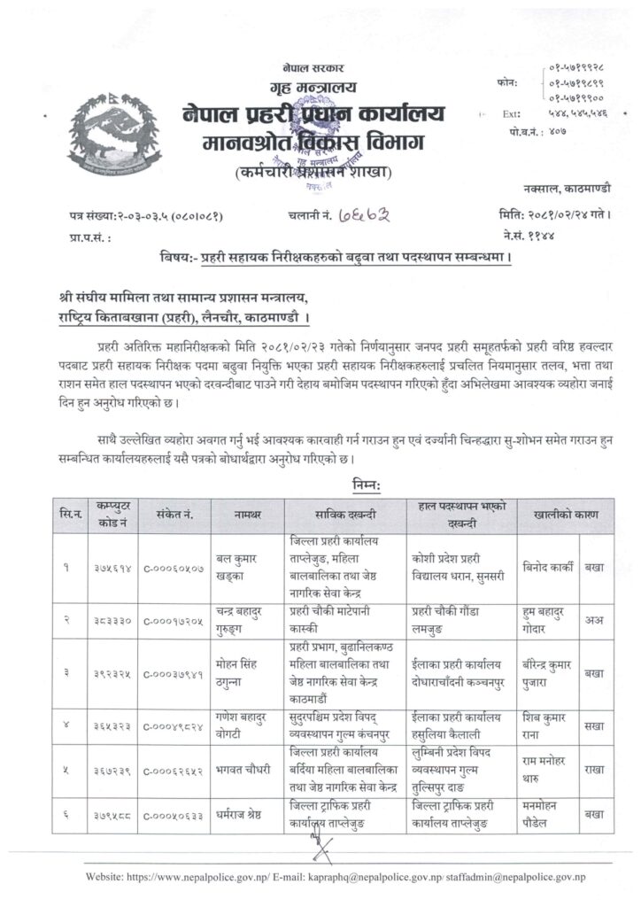 काठमाडौं । नेपाल प्रहरी प्रधान कार्यालय मानवश्रोत विकास विभाग कर्मचारी प्रशासन शाखाले प्रहरी सहायक निरीक्षक (असई) र प्रहरी वरिष्ठ हवल्दारहरूको पदस्थापना गरेको छ ।