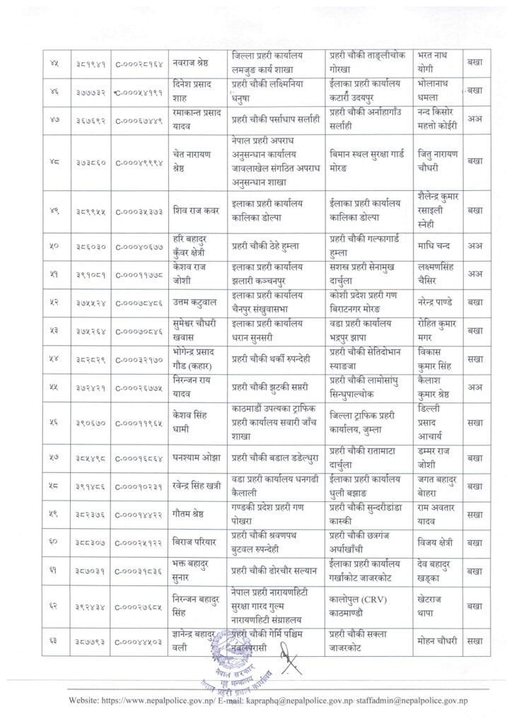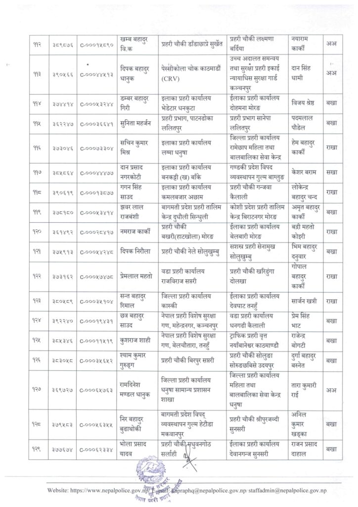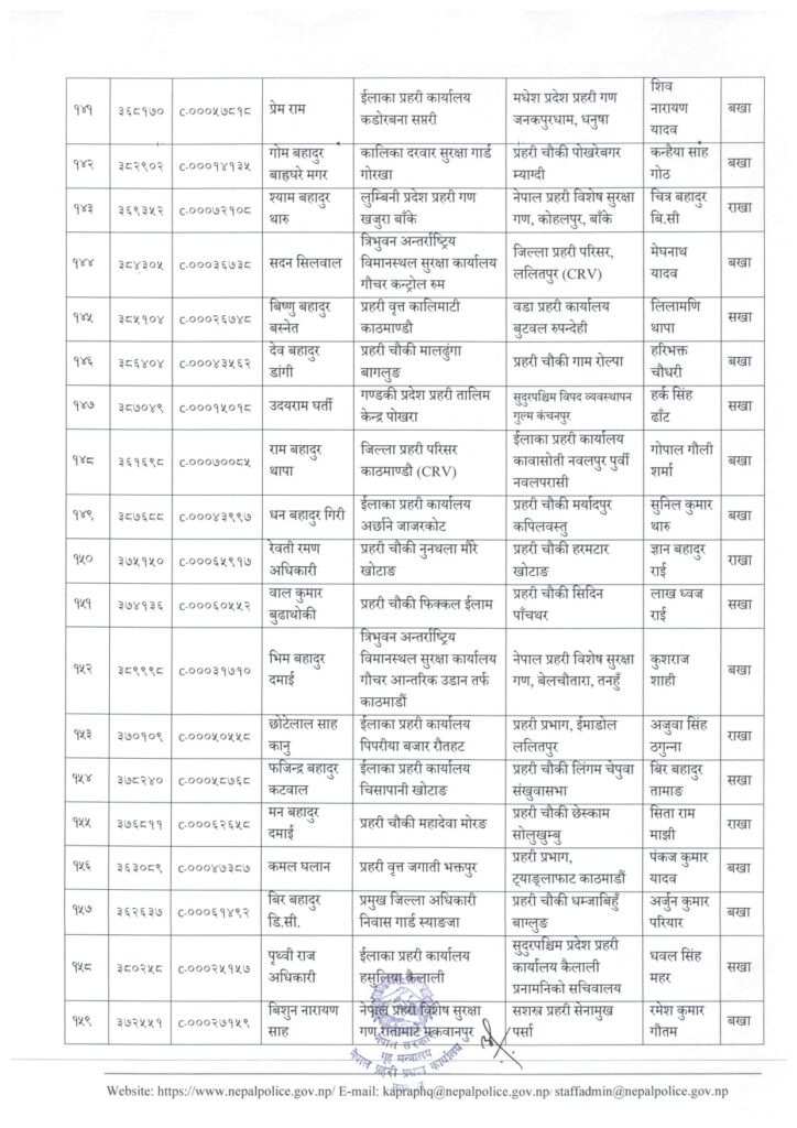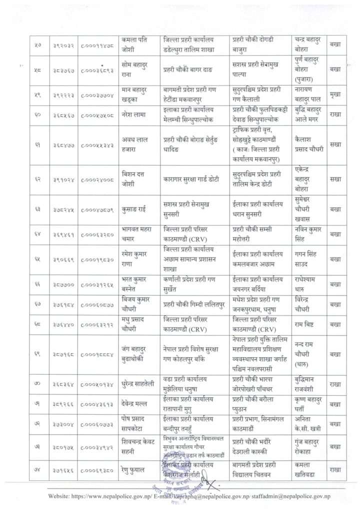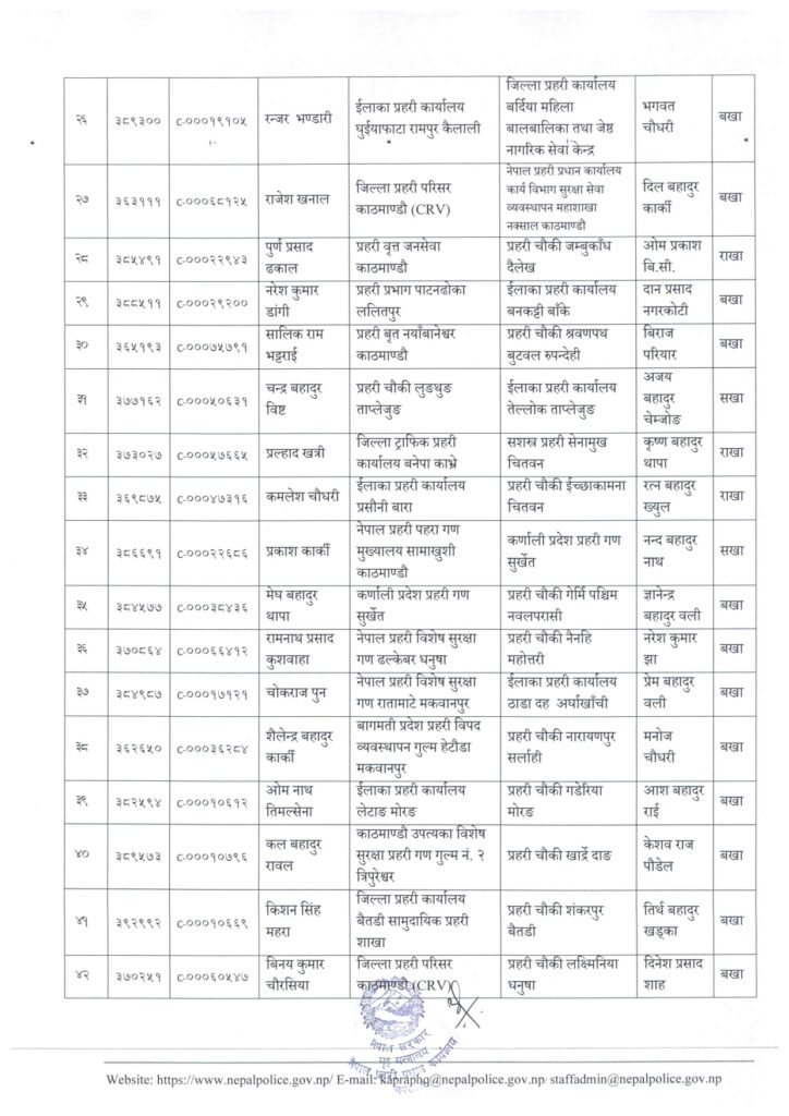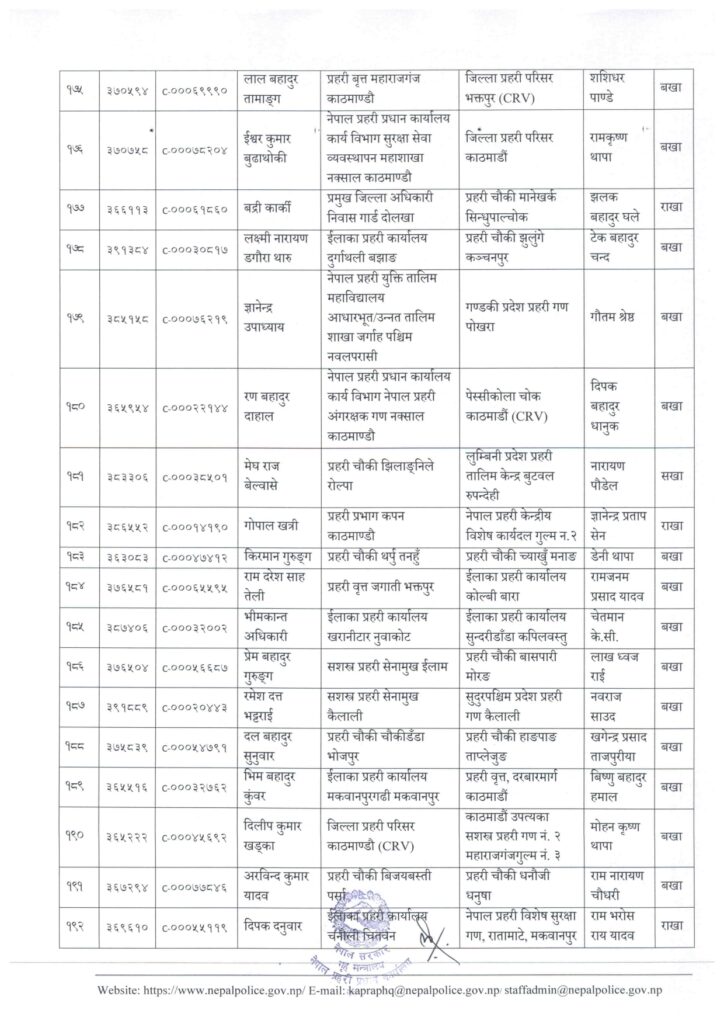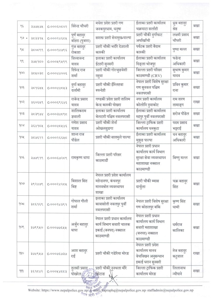 काठमाडौं । नेपाल प्रहरी प्रधान कार्यालय मानवश्रोत विकास विभाग कर्मचारी प्रशासन शाखाले प्रहरी सहायक निरीक्षक (असई) र प्रहरी वरिष्ठ हवल्दारहरूको पदस्थापना गरेको छ ।