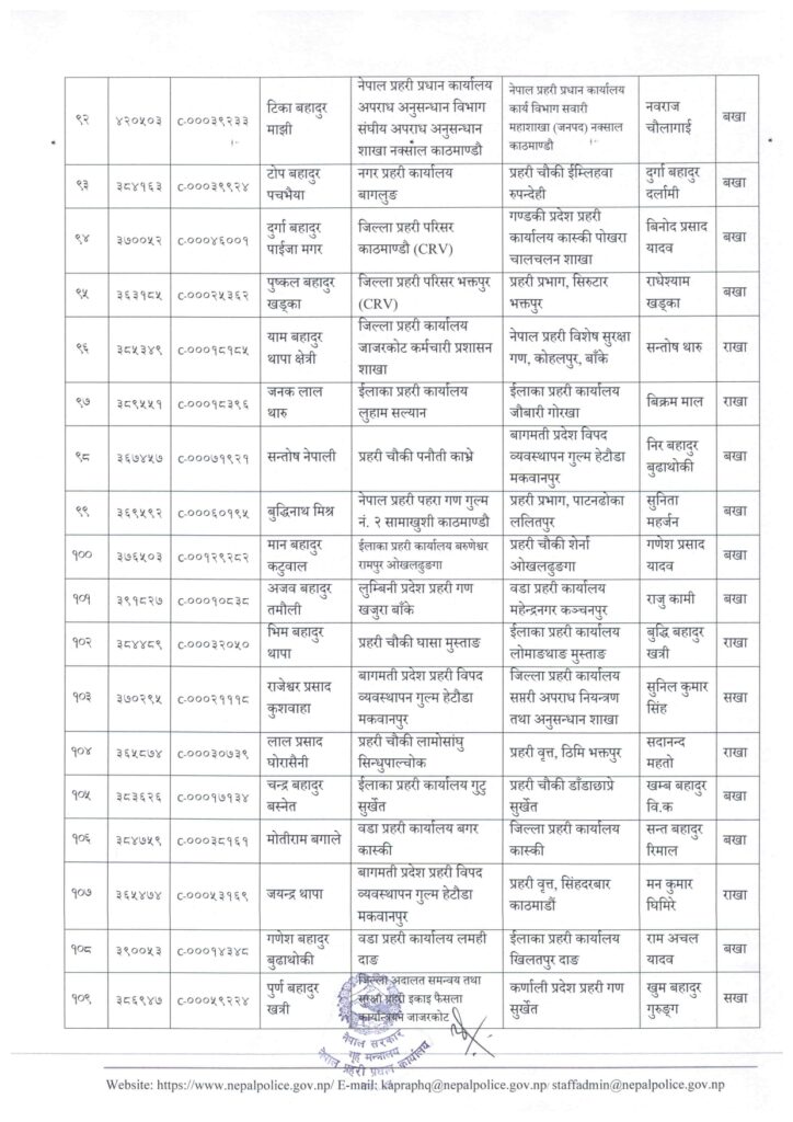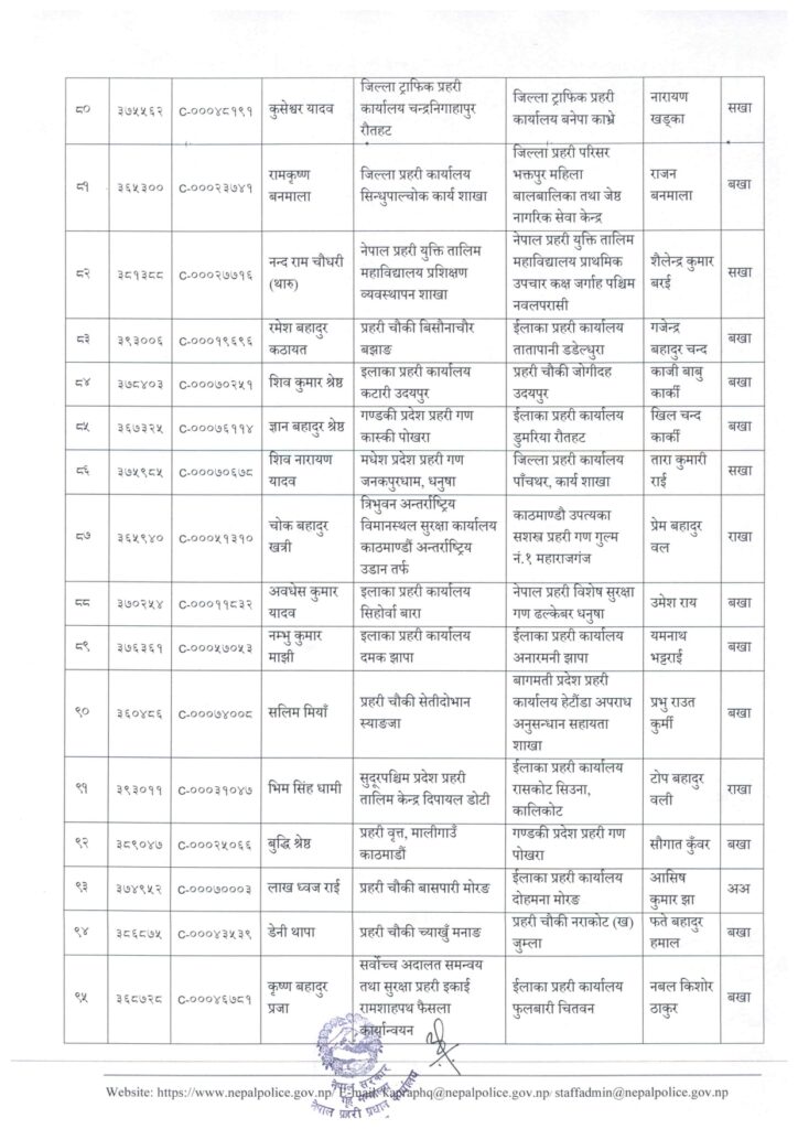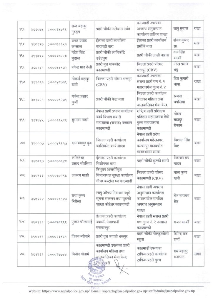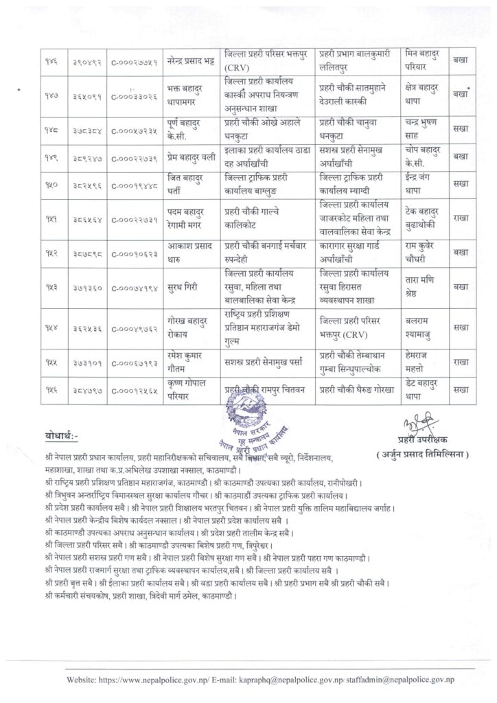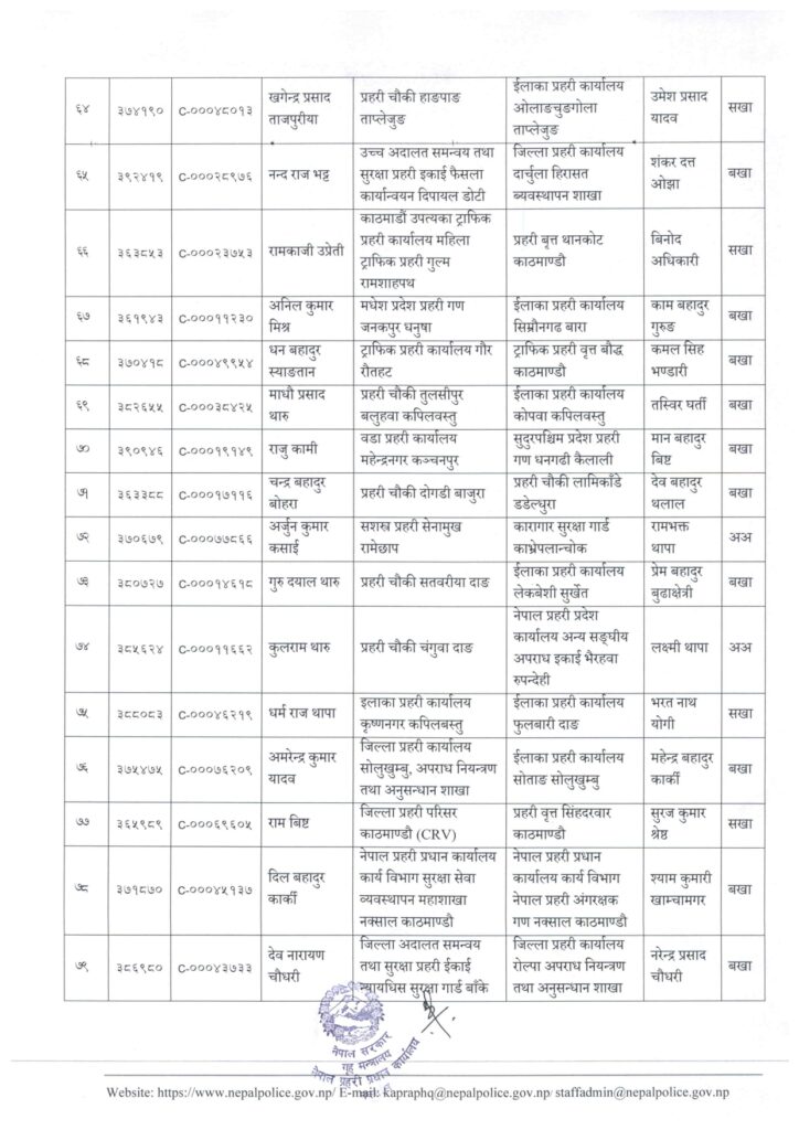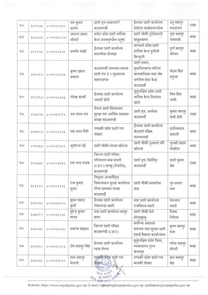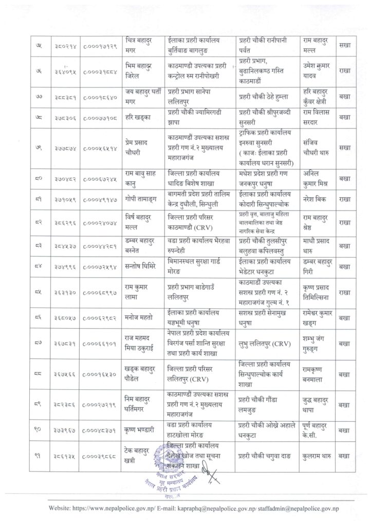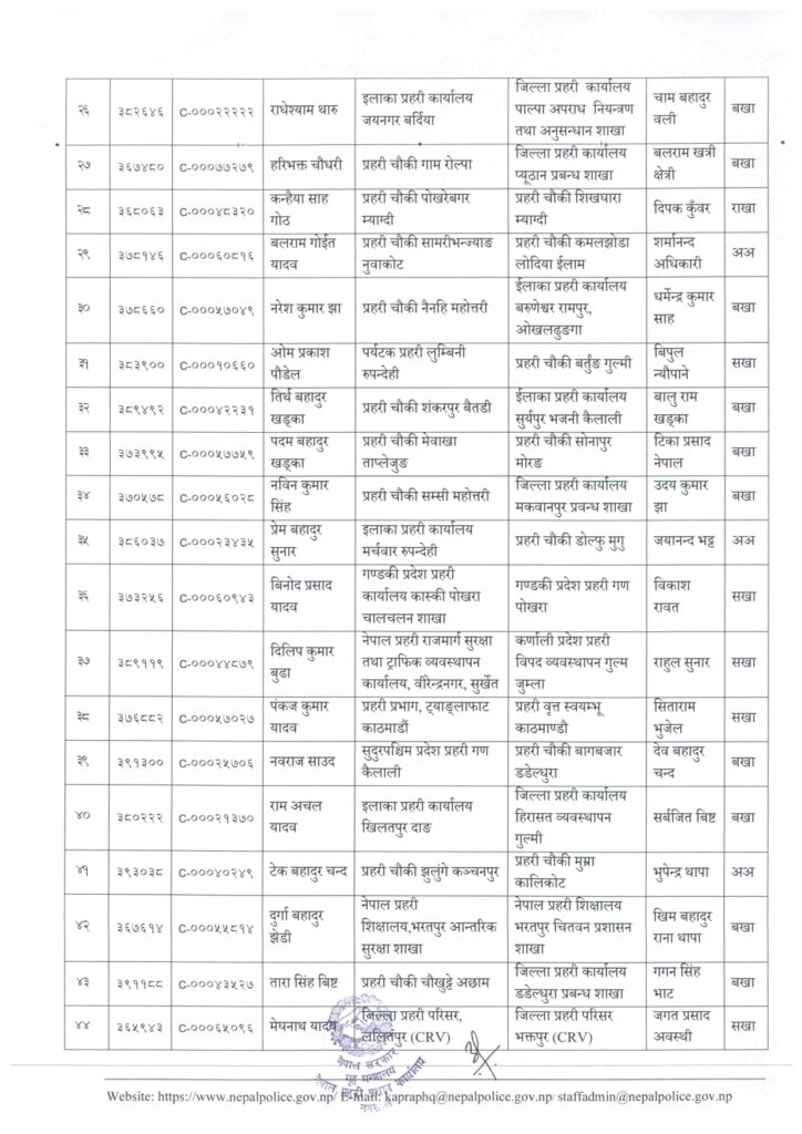 काठमाडौं । नेपाल प्रहरी प्रधान कार्यालय मानवश्रोत विकास विभाग कर्मचारी प्रशासन शाखाले प्रहरी सहायक निरीक्षक (असई) र प्रहरी वरिष्ठ हवल्दारहरूको पदस्थापना गरेको छ ।