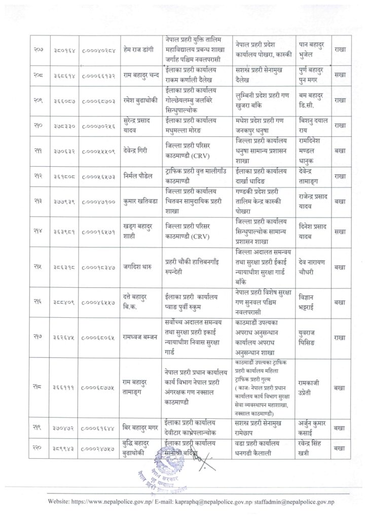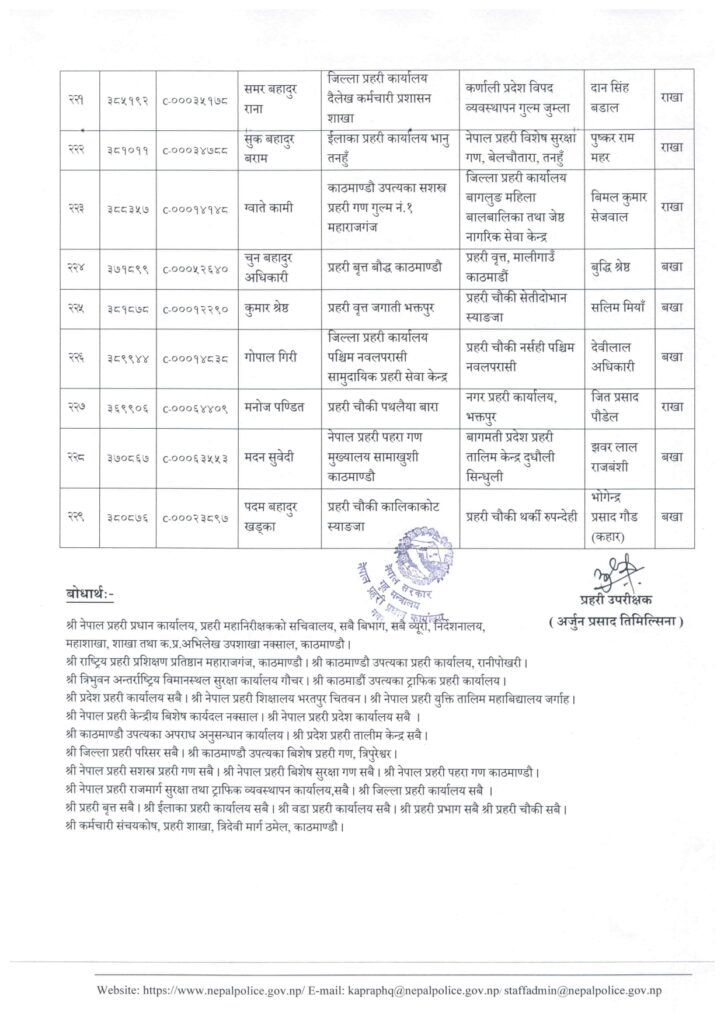 प्रहरी सहायक हवल्दारबाट प्रहरी वरिष्ठ हवल्दारमा बढुवा भएका २२९ जनालाई पनि हेडक्वाटरले पदस्थापना गरेको छ ।