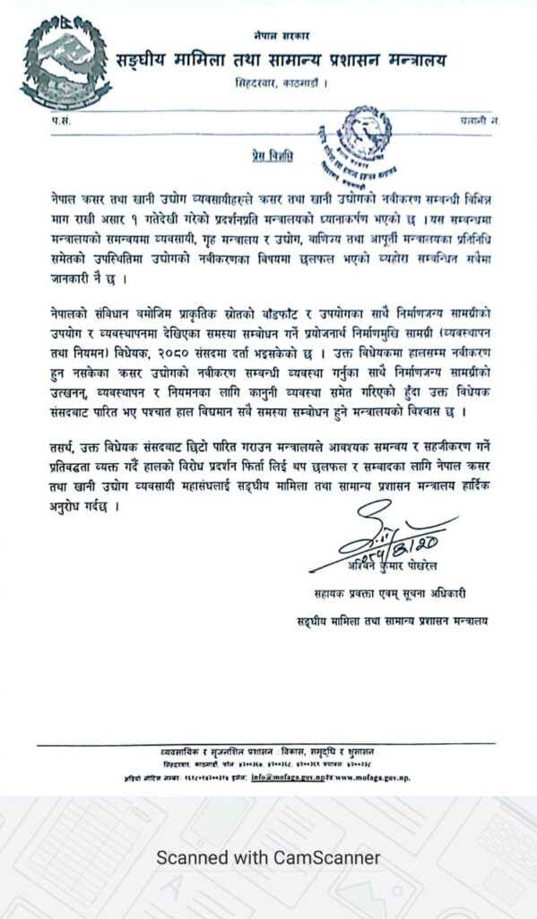 मन्त्रालयले भनेको छ, ‘नेपाल क्रसर तथा खानी उद्योग व्यवसायीहरूले क्रसर तथा खानी उद्योगको नवीकरण सम्बन्धी विभिन्न माग राखी असार १ गतेदेखि गरेको प्रदर्शनप्रति मन्त्रालयको ध्यानाकर्षण भएको छ ।’