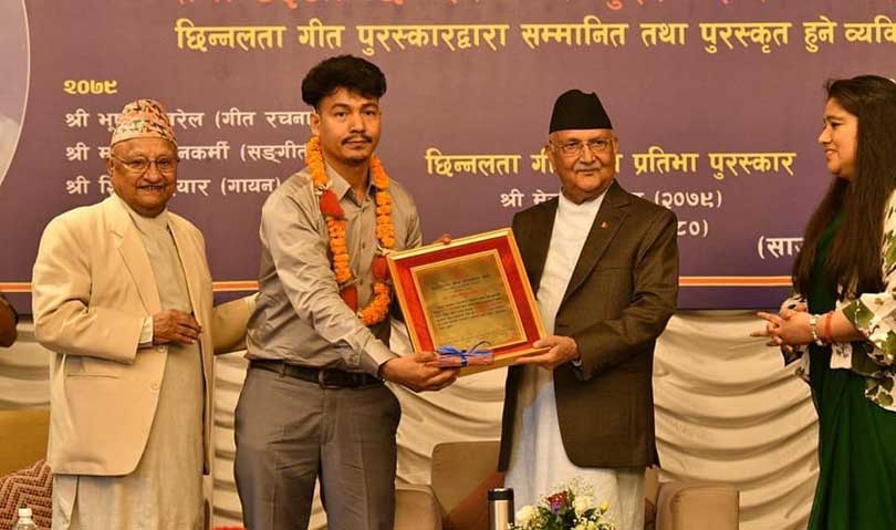प्रधानमन्त्री ओलीद्वारा गायक भुपु पाण्डेलाई छिन्नलता युवा गायक पुरस्कार प्रदान