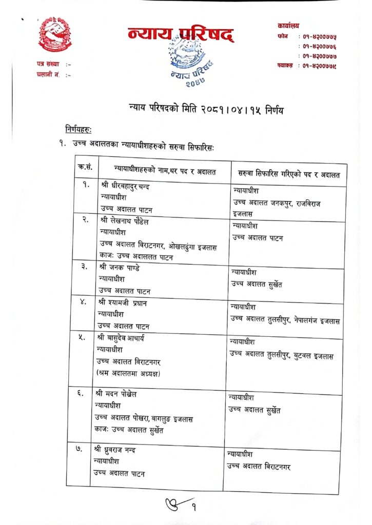 काठमाडौं । न्याय परिषदले ९१ जना न्यायाधीशहरूको सरुवा गरेको छ ।