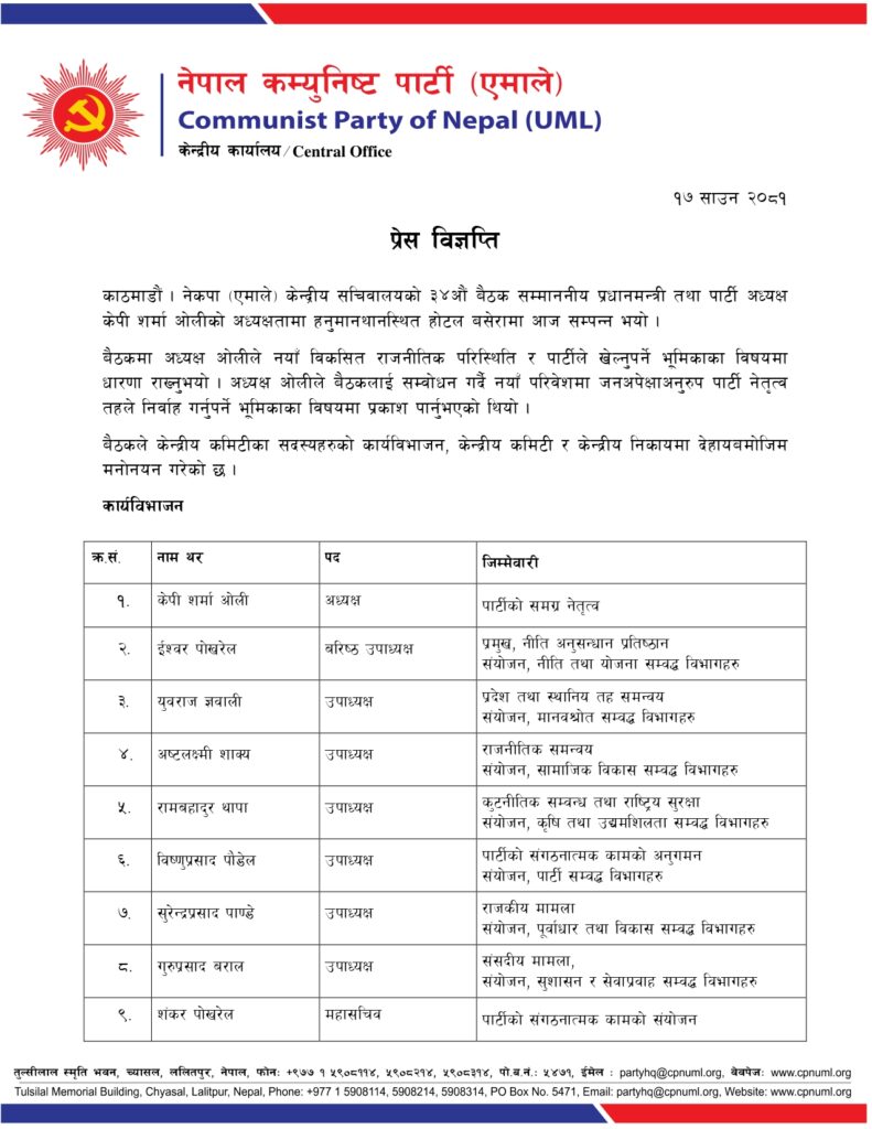 काठमाडौंमा बिहीबार बसेको सचिवालय बैठकले केन्द्रीय सदस्यहरूको कार्यविभाजन गरेको विज्ञप्तिमा उल्लेख छ । नेताहरूलाई मनोनयन र प्रदेश ईञ्चार्जहरूमा समेत हेरफेर गरेको एमालेले जनाएको छ ।